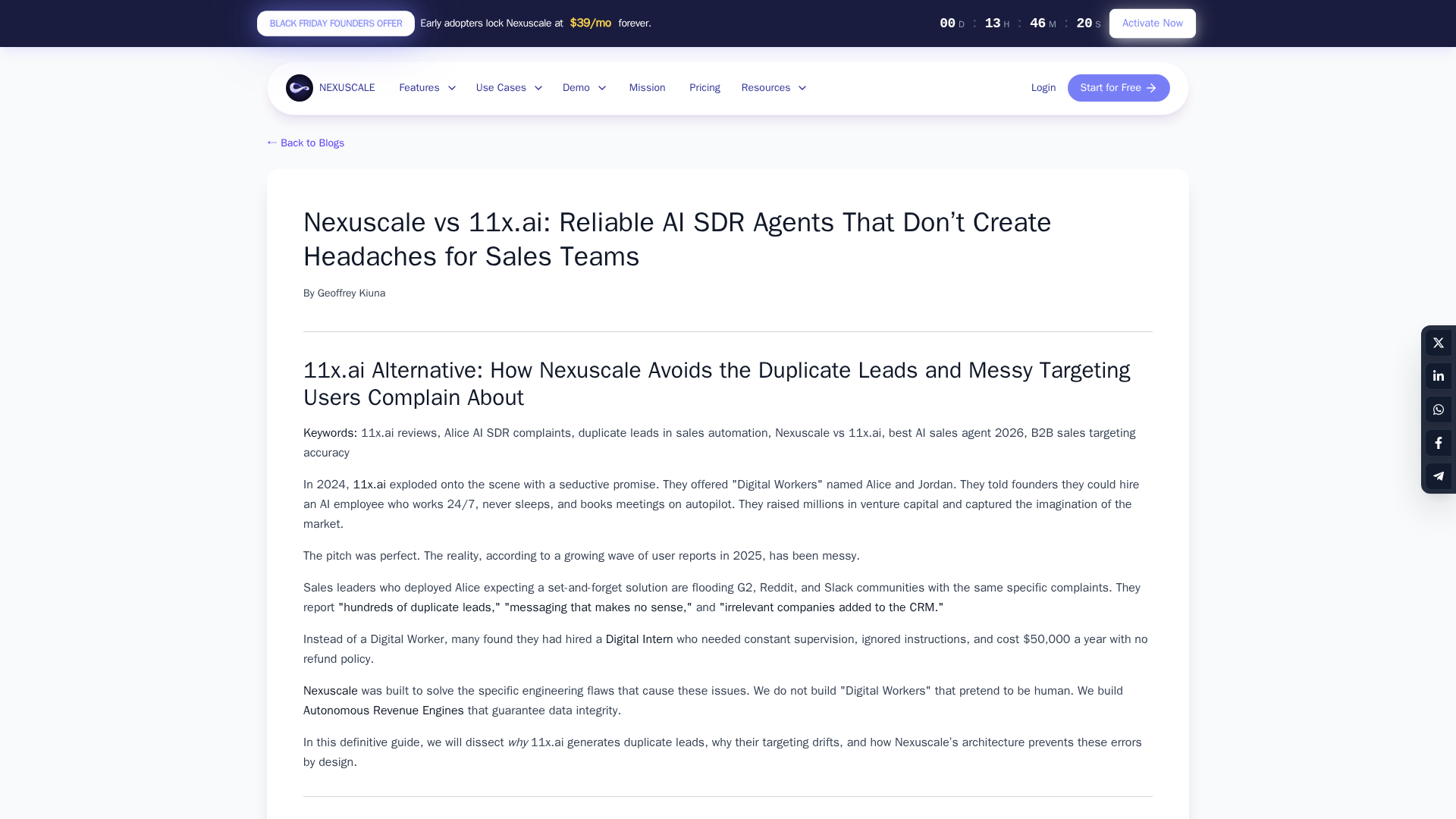 A concise comparison of Nexuscale and 11x AI SDR agents for reliable, headache-free sales automation.