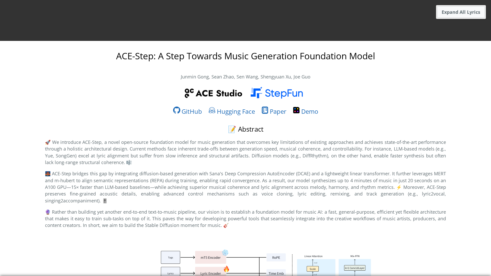 Open-source foundation model for fast, coherent, and controllable music generation blending diffusion, DCAE, and lightweight transformers.