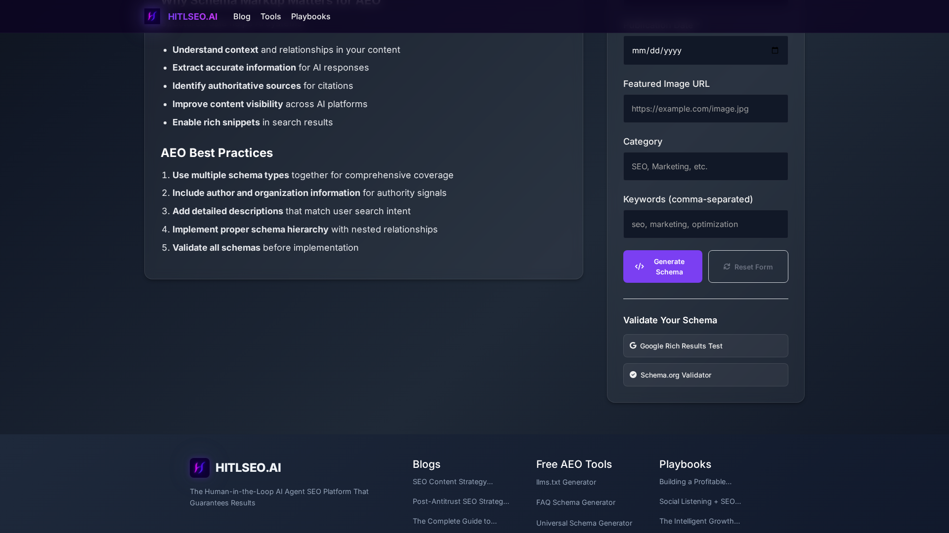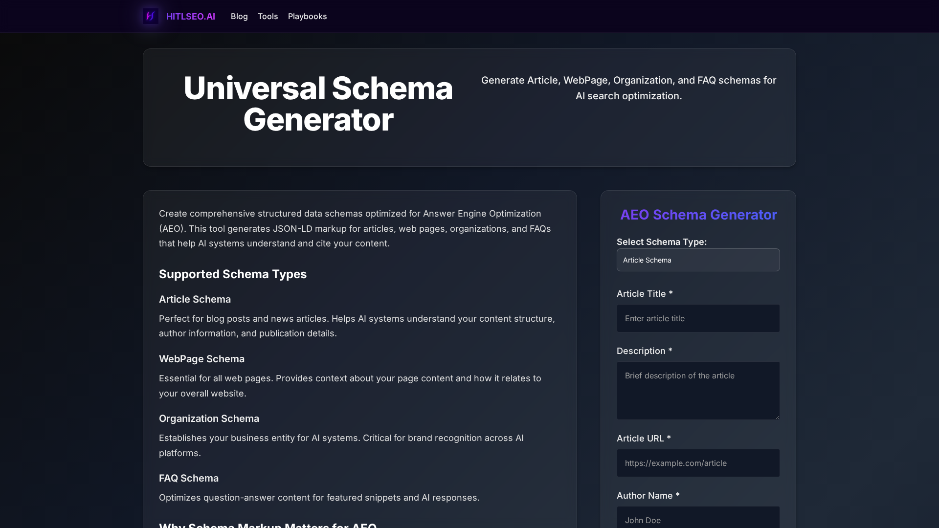 The Universal Schema Generator produces comprehensive JSON-LD structured data optimized for Answer Engine Optimization (AEO). It supports Article, WebPage, Organization and FAQ schema types, helps AI systems understand page structure, provides author and organization signals, and helps content be citable by AI-driven answer engines. The page explains why schema matters for AEO, lists best practices (use multiple schema types, include author/org info, detailed user-intent descriptions, hierarchical/nested schema relationships, and validation), and encourages validating schemas before deployment.