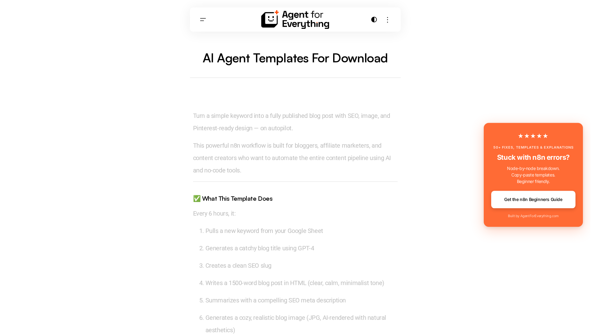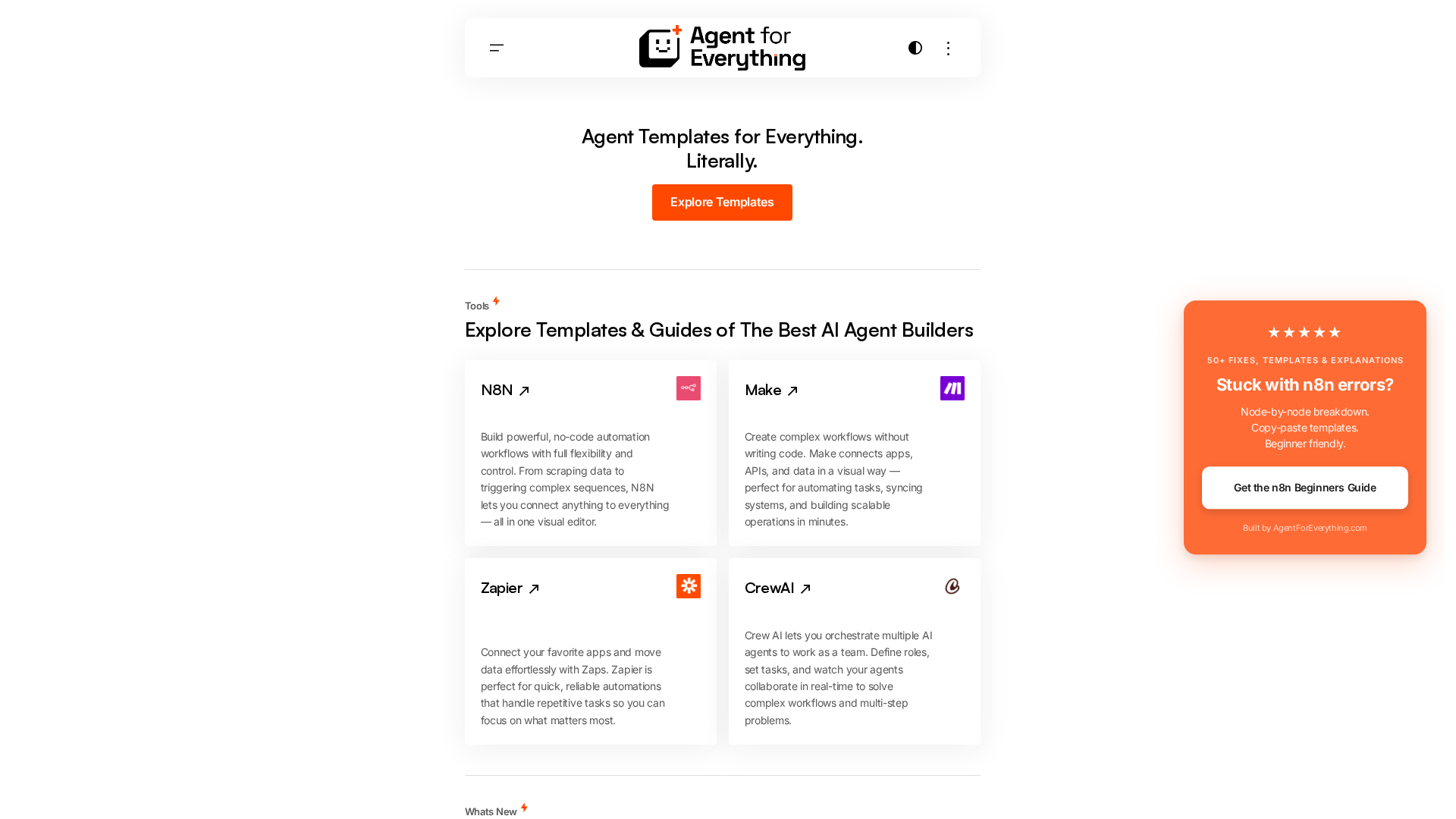 Agent For Everything is a practical, template-driven resource for building no-code and low-code AI automations. The site curates 50+ fixes, ready-to-paste n8n templates, node-by-node breakdowns, and step-by-step guides (for example, integrating ChatGPT with n8n). It emphasizes hands-on acceleration: copy-paste workflows, troubleshooting at the node level, and quick deployments on platforms like n8n, Make, and Zapier. The site also distributes paid, one-time templates (via a Gumroad/ templates storefront) and offers a focused newsletter (“Gumloop / AI Automation newsletter”) to deliver new templates and guides to subscribers.
