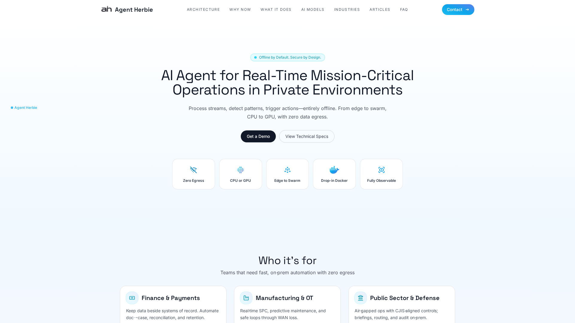 An overview of Agent Herbie, the offline AI agent designed for air-gapped, on-prem deployments.