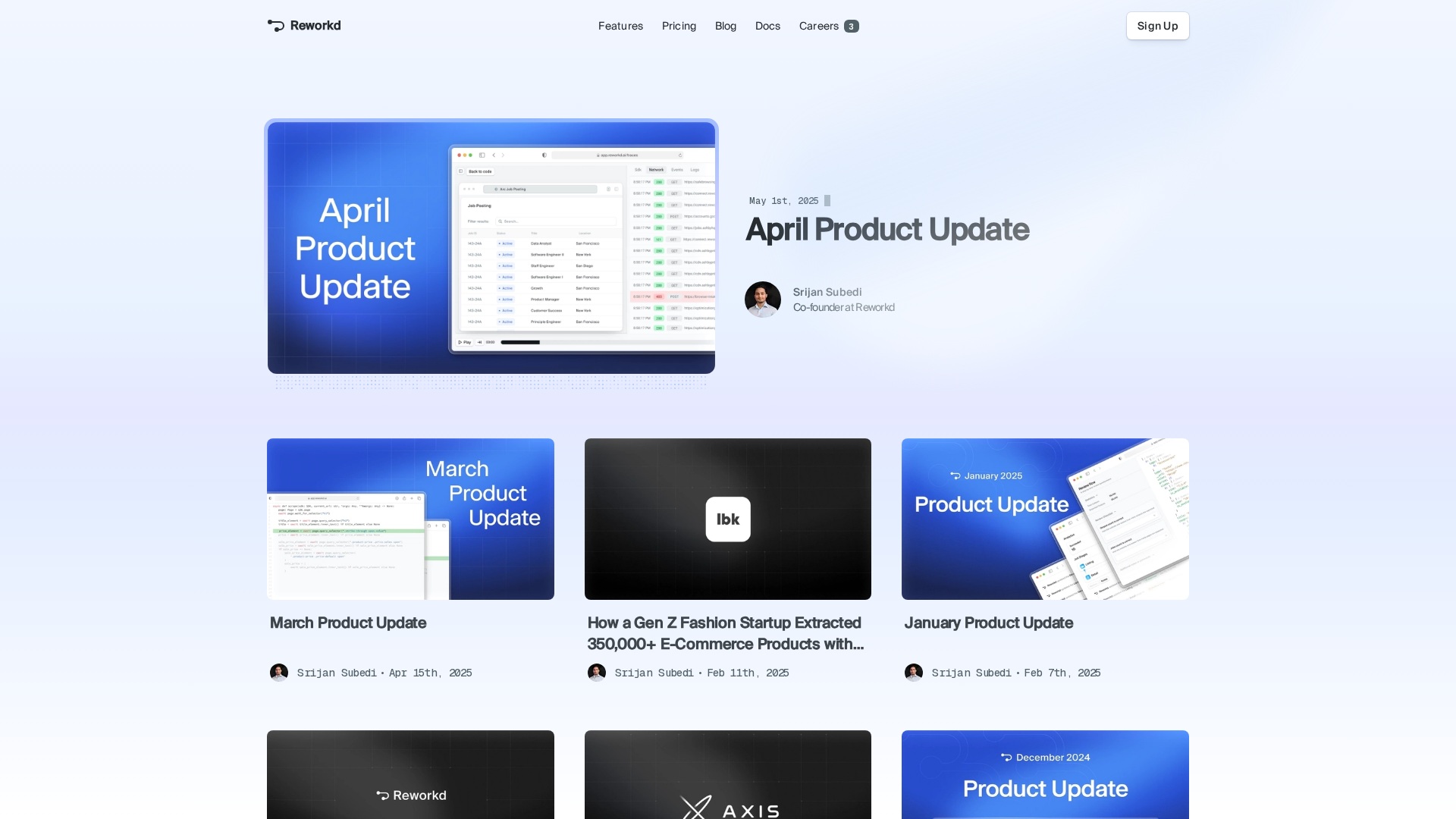 A hub of Reworkd blog updates, partnerships, and funding milestones from 2023–2025.