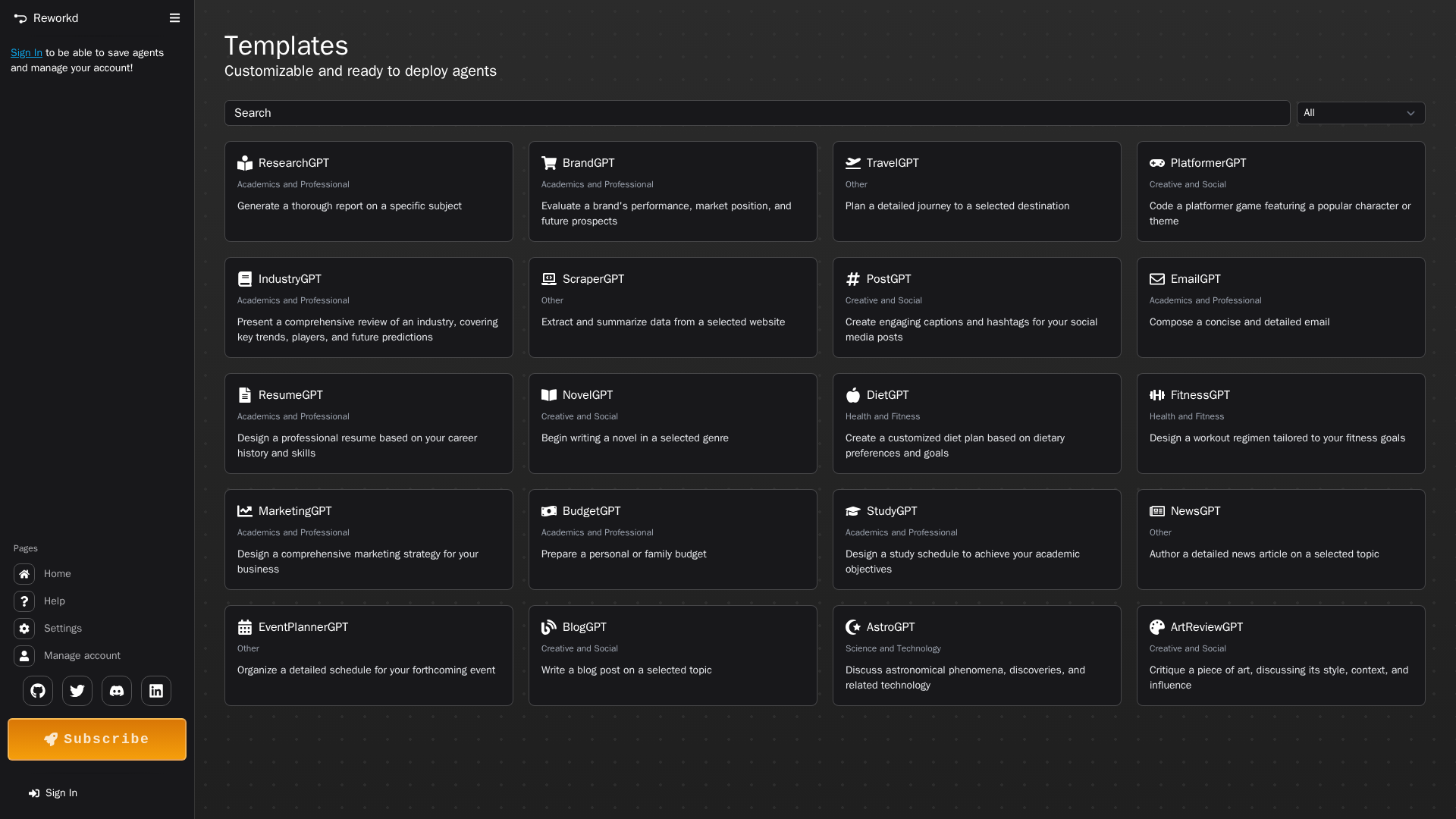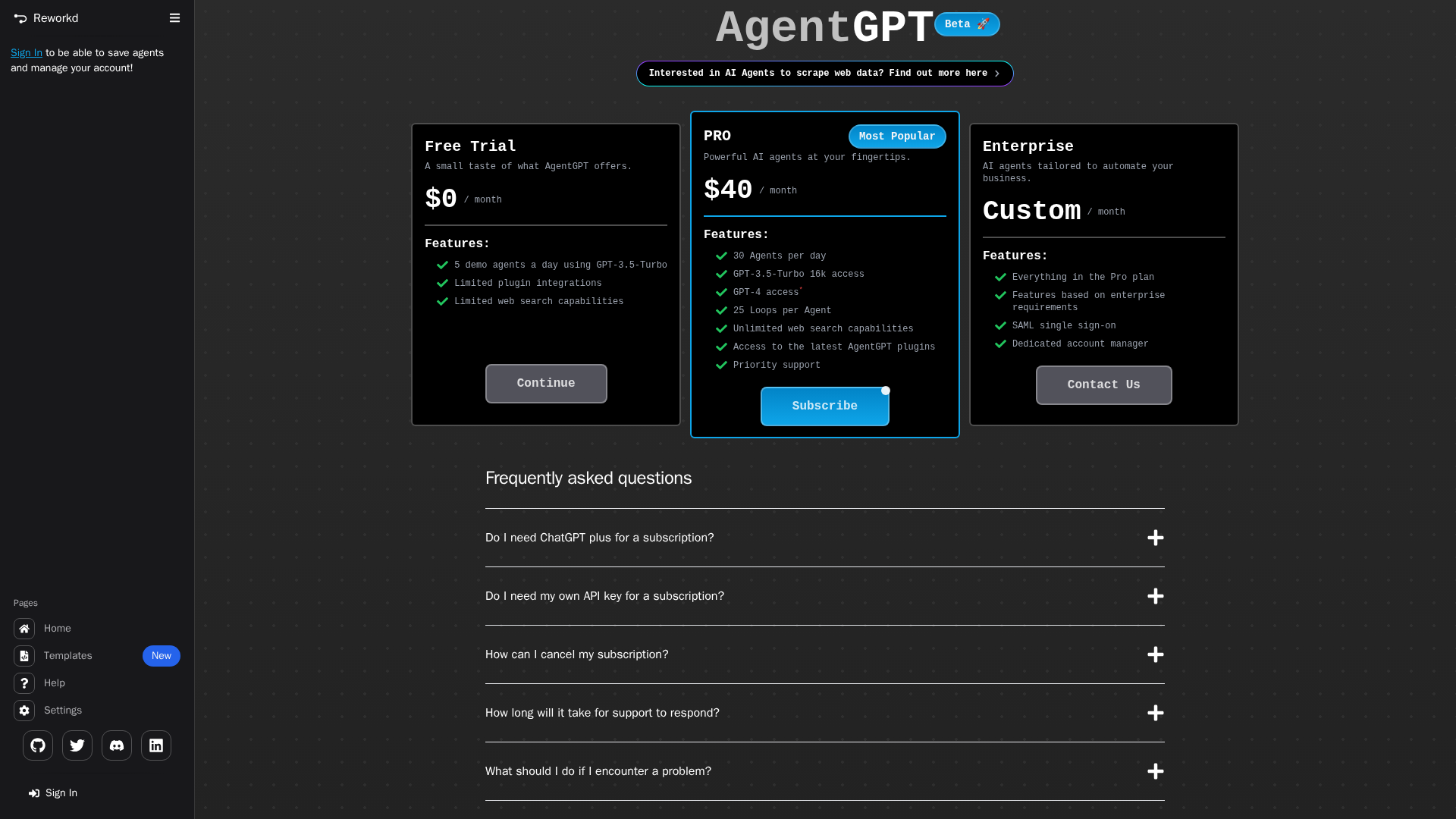 AgentGPT is an in‑browser, no‑code platform for building, configuring, and deploying autonomous AI agents by providing a name and goal. It offers a template library (ResearchGPT, TravelGPT, StudyGPT, BrandGPT, ScraperGPT, etc.), model access to GPT‑3.5 and (on paid tiers) GPT‑4, plugin integrations and web search, and enterprise features (SAML SSO and dedicated account support). The UI emphasizes quick, goal‑driven agent creation and iterative “thinking” loops so agents can plan, act, and evaluate autonomously. (Noted content drawn from the product homepage, templates library, and pricing pages.)