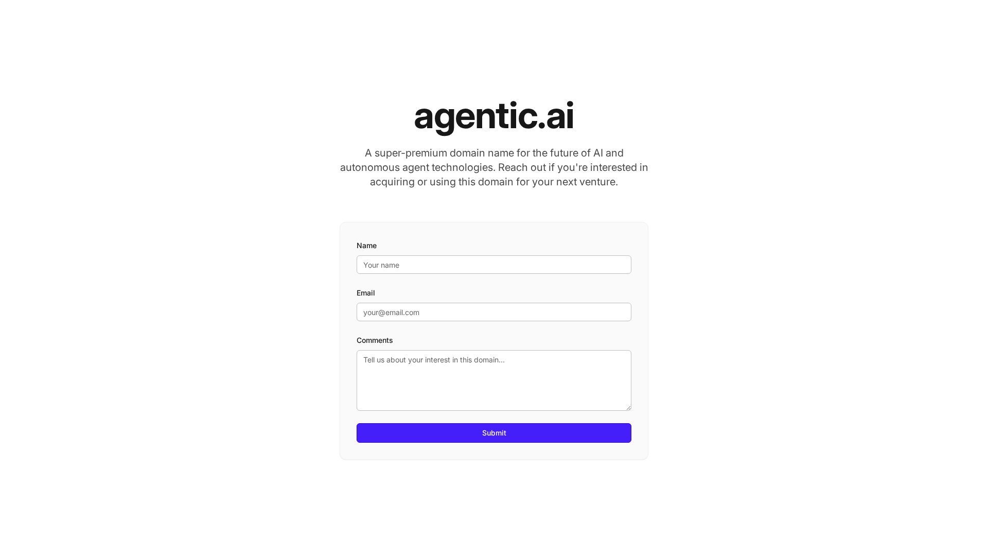 Agentic (agentic.ai) is presented as a premium domain asset aimed at AI and autonomous-agent-focused businesses. The site markets agentic.ai as a high-value branding opportunity for AI startups, companies, or projects seeking a memorable, marketable web identity. The site contains minimal product pages and primarily serves as a landing/contact point for acquisition inquiries rather than a software product or service. Publicly available information on company background, team, launch year, pricing, transaction process, and support resources is not published on the site. The /docs page contains a meta-prompt for generating article metadata rather than conventional product documentation. The pricing page exists but contains no extractable plan data; interested parties must use the contact page to request pricing and acquisition details.