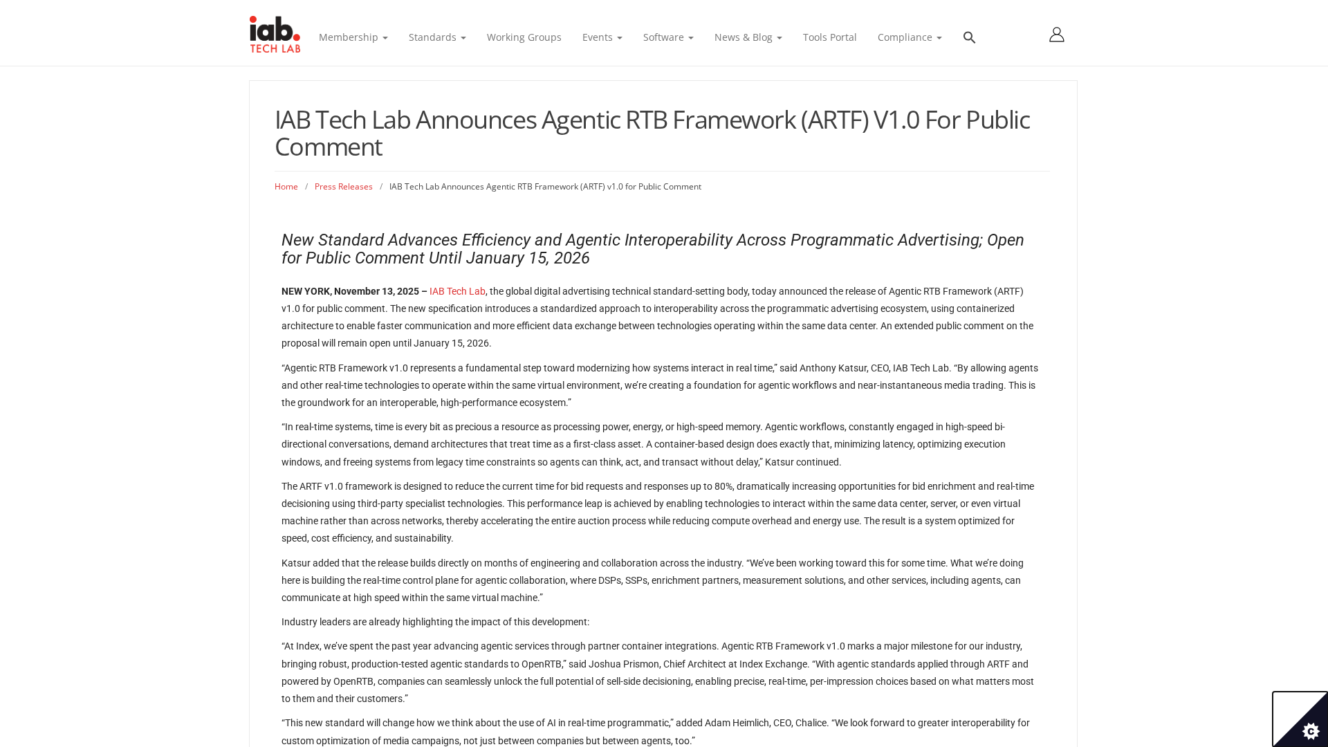 IAB Tech Lab opens ARTF v1.0 for public comment, a containerized, agentic RTB framework for ultra-fast interoperability.