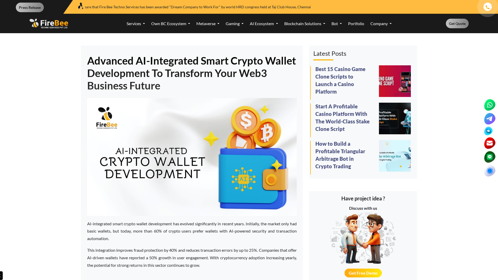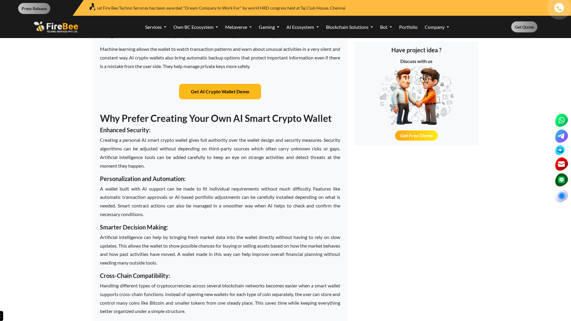 Overview: The Fire Bee Techno Services page on AI-Integrated Smart Crypto Wallet Development provides a structured summary of building AI-powered wallets on Aptos. It highlights high-level claims about security, automation, and UX improvements, with figures such as >60% users preferring AI-enabled wallets, ~40% improvement in fraud protection, up to 25% reduction in transaction errors, and ~50% increase in engagement for AI-enabled wallets. The article enumerates main use-cases for AI in wallets: fraud prevention and anomaly detection, predictive market insights and portfolio optimization, automated trading and rebalancing under user-defined rules, intelligent UX with an in-wallet AI chatbot, and automation of backups and safer private-key management. It lists core features: fraud detection & behavior profiling; portfolio optimization and AI-driven suggestions; AI chatbot / in-wallet assistant; multi-chain / cross-chain support and token management; automated trading rules & auto-execute based on thresholds; private key management (MPC, multi-sig options); automatic backups and safe recovery mechanisms. It describes a development roadmap (define core features, environment setup for Aptos, build blockchain layer, integrate AI models, UI, testing, deployment). It notes wallet types and security options and provides recommended next steps for vendors, including proposals, demos, case studies, IP terms, and NDA considerations.