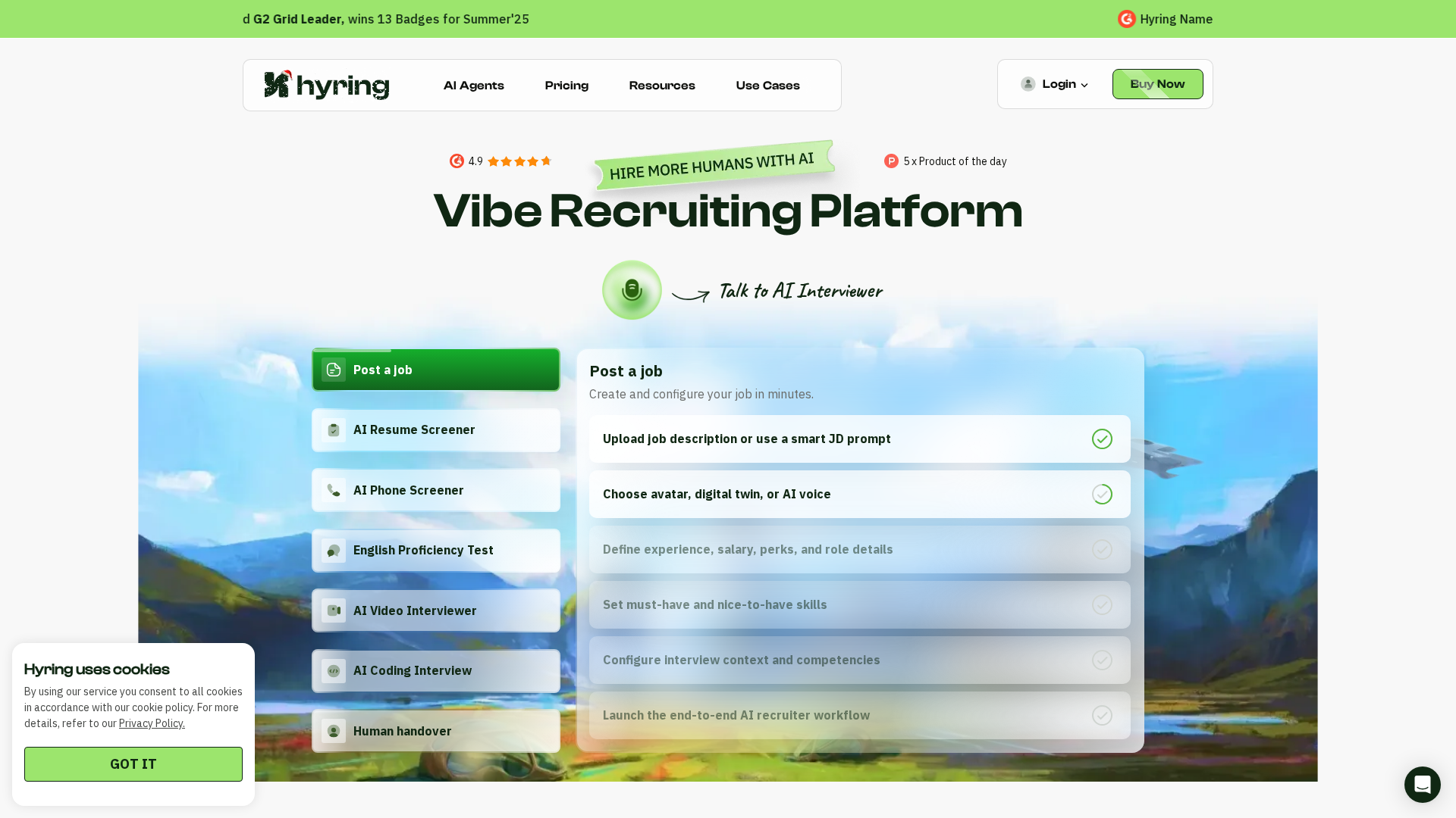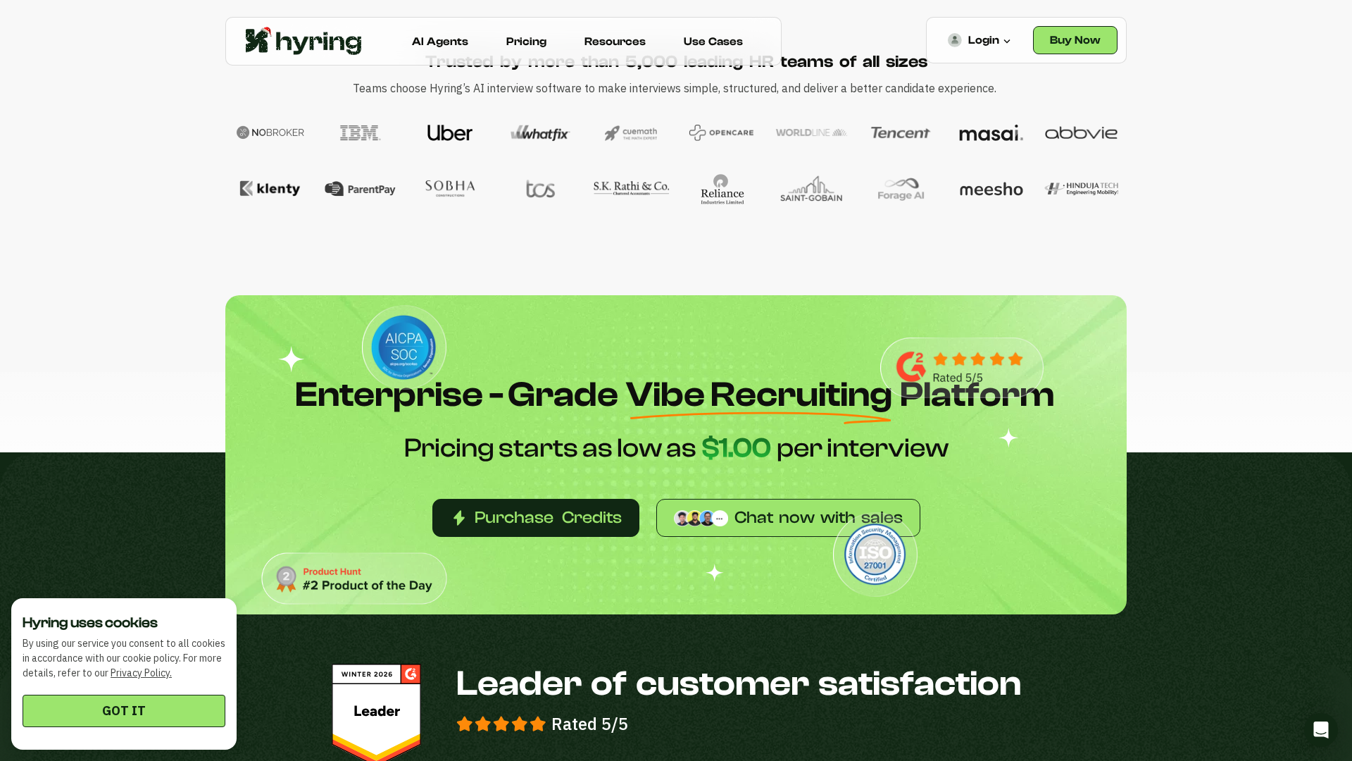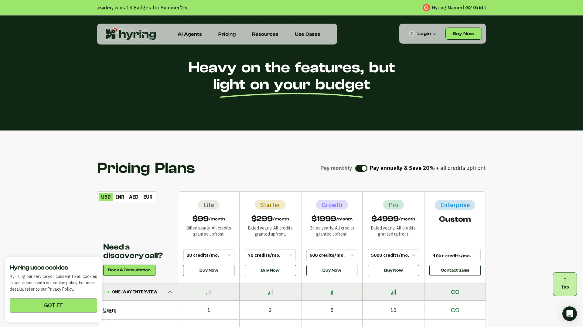 Hyring is an all-in-one AI recruiting suite that focuses on automating pre-screening and interviewing workflows. Core products include the AI Video Interviewer (one-way and two-way), AI Coding Interviewer, AI Phone Screener, AI Resume Screener, and CEFR-based English Proficiency testing. The platform emphasizes proctoring and cheat detection, automated scoring, candidate reports, and human-led final decisions. Pricing is based on subscriptions plus a credits/usage model, with annual billing offering savings and upfront credits; enterprise pricing is custom. Key capabilities span video interviewing with transcripts and scorecards, live coding with multi-language support, automated phone screens, resume parsing and scoring, and CEFR-based English assessments. Multilingual support, collaboration features, and integrations (e.g., Slack) are noted. Public pricing outlines Lite, Starter, Growth, Pro, and Enterprise tiers with per-interview cost estimates and retention windows. The Help Center, Terms, Privacy Policy, and use cases (including Deloitte, PwC, EY, KPMG) are referenced, along with product pages and contact options for enterprise quotes and pilots.