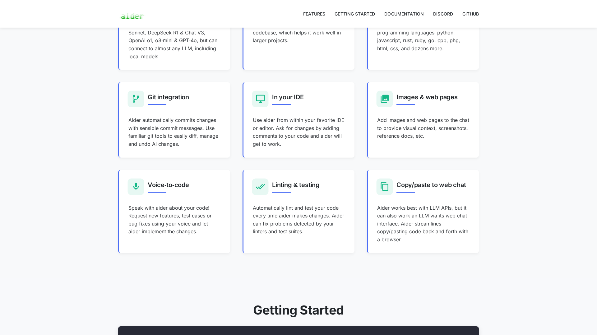 Aider (aider.chat) is an open-source AI pair-programming tool that runs in the terminal and via a browser chat. It pairs your codebase with LLM "copilots" to make context-aware edits, run linters/tests, and commit sensible changes to git. Primary values are repository mapping to provide models wider context, multi-LLM support (OpenAI, Anthropic, DeepSeek, local models and more), and git integration so AI-generated edits are applied as commits you can diff and undo. Key features described in the documentation include multi-LLM model switching, a repository map that builds concise context for models, support for diffs and whole-file edits, automatic commit creation with sensible messages and undo support, IDE/editor integrations (including comments-based use and Codespaces), quality workflows that can run linting/tests and fix issues, attachments and input such as images and web pages for visual context, voice interactions, prompt caching for some providers, exhaustive CLI configuration (model selection, API keys, caching, repo map behavior, git handling, theming, debugging), and scripting/automation via CLI or Python for integration into workflows (e.g., GitHub Actions). The project is open-source (GitHub: https://github.com/Aider-AI/aider) under Apache 2.0. Documentation pages include installation, CLI options reference, usage guide, repomap docs, leaderboards/benchmarks, advanced model settings, git integration docs, privacy policy, and release history. The site contains no explicit hosted product pricing or free-trial information; the available content focuses on open-source tooling and documentation. Recommended next steps are following the install docs to try locally, reviewing CLI options and advanced model settings to configure models and costs, and cloning the GitHub repo for examples and contribution guidance. If details about hosted/paid offerings are needed, the documentation suggests contacting the community (Discord) or opening a GitHub issue to confirm.