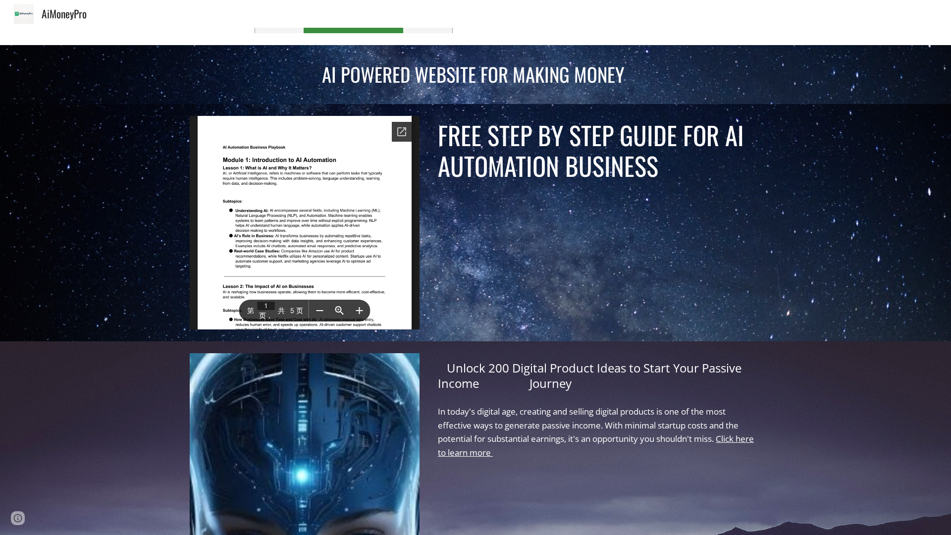 AiMoneyPro presents itself as an AI-powered hub and promotional guide for making money online in the AI era. The site focuses on low-startup-cost paths to passive income, offering a free step-by-step guide, a large list of 200 digital product ideas, and walkthroughs for monetizing AI-generated art, Google Bard productivity-to-income workflows, and affiliate marketing. It repeatedly promotes quick-start paths such as launching an AI Art business on marketplaces (Etsy, Redbubble), selling AI Notion templates, offering AI-powered resume services, and exploring Micro SaaS using no-code AI tools. The site appears to function mainly as an affiliate/promotional portal — directing readers to partner platforms (e.g., Digistore24) and paid third-party products while promising practical, beginner-friendly methods to earn the first $1,000 and ongoing passive income. Tone is aspirational and marketing-focused with repeated calls-to-action.