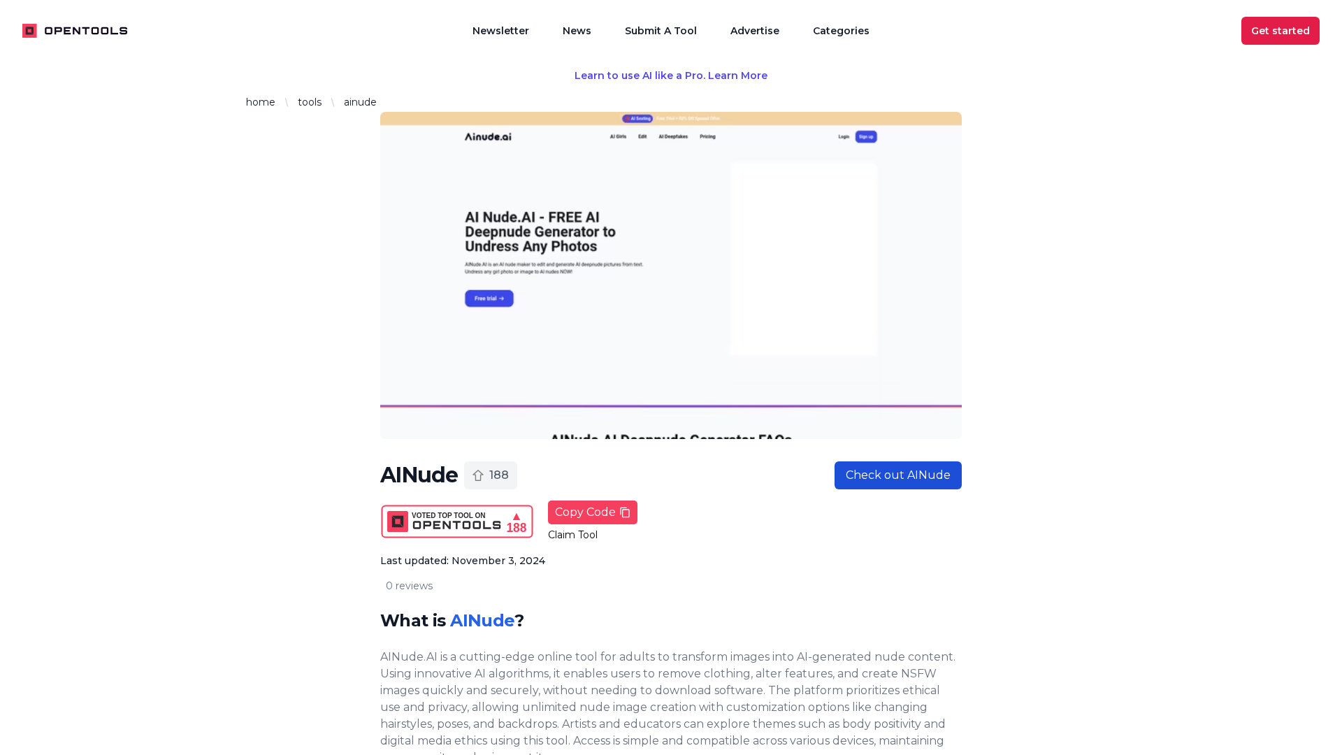 I could not load https://ainude.ai directly (DNS/name resolution failed). The following summary is compiled from aggregated third-party reviews, listings and news items (opentools.ai, aitools.fyi, aiwizard, coupon/affiliate pages, comparison listings, and researcher writeups). Key points (sourced to third-party coverage): platform is a browser-based web tool for desktop and mobile browsers; core capability is nudification/clothing removal and generation of realistic nude images from user photos or prompts (often characterized as “DeepNude”-style AI); reported editing/customization options include body feature adjustments (e.g., chest size), hairstyle, pose and background, plus image-editing presets; vendors/reviews commonly advertise fast processing and privacy-focused messaging (claims of no persistent public posting and sometimes no account required for some operations); multiple third-party listings mention a free trial or limited free tier and paid subscriptions/credits for higher-quality or unlimited usage, but exact plans/pricing could not be verified because the official site was inaccessible. Additional concerns from web reports and a researcher writeup include malicious redirects/honeypot activity associated with related domains and a legal filing referencing similar sites in an NCII (non-consensual intimate images) context. Because the official domain was unreachable, all information below is based on third-party sources and should be treated as unverified until the official site or authoritative documents (pricing page, TOS, privacy policy) can be accessed and examined.