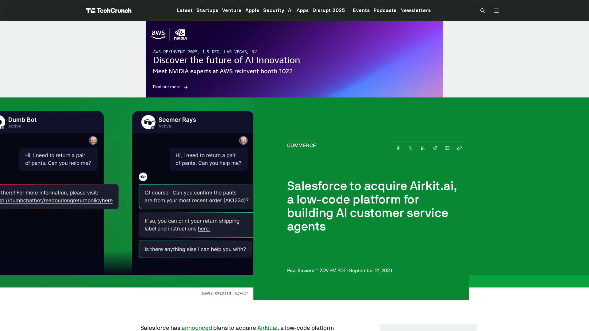 Salesforce to acquire Airkit.ai, a low-code AI customer-service platform, to integrate into Service Cloud.