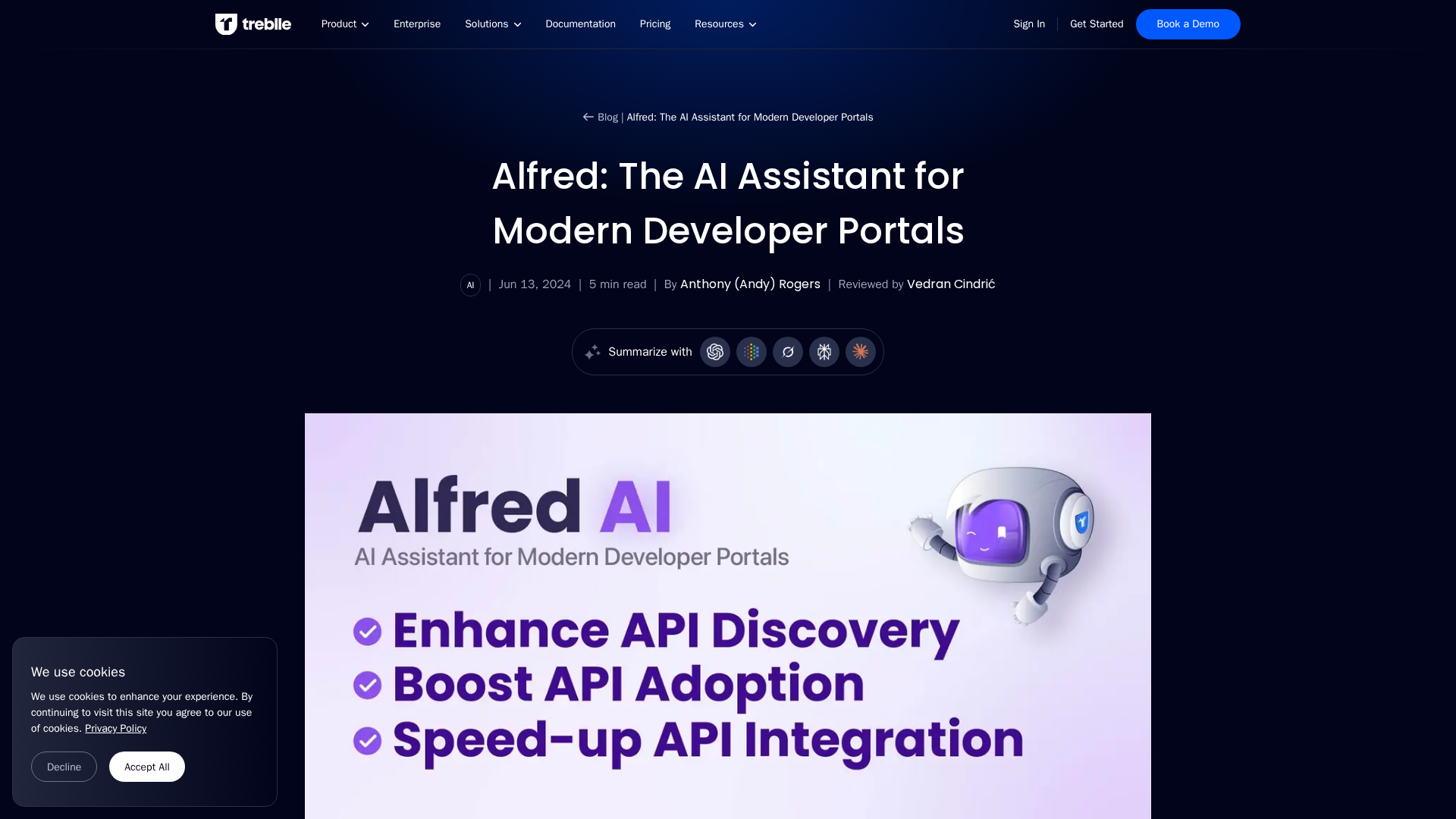 Alfred AI is Treblle's embeddable AI assistant for developer portals that auto-generates code, models, and integrations from API docs.
