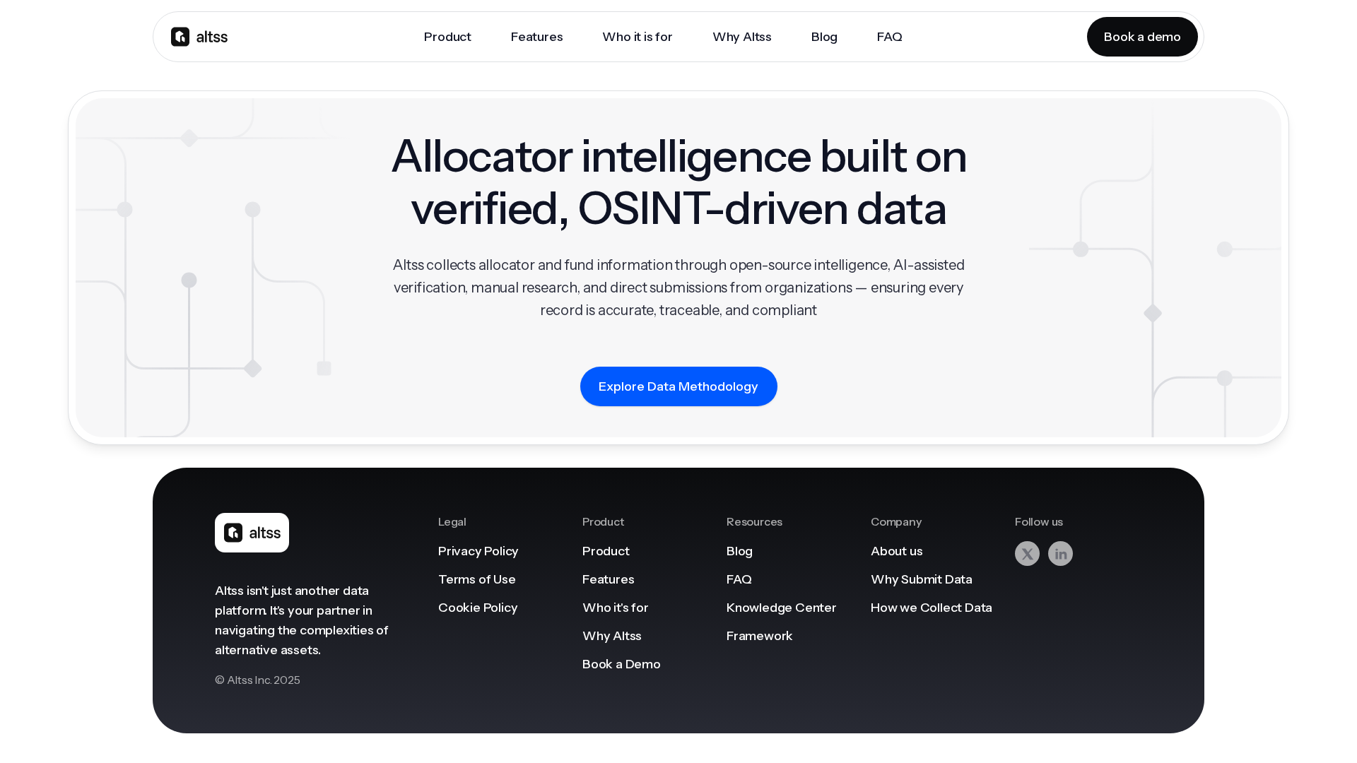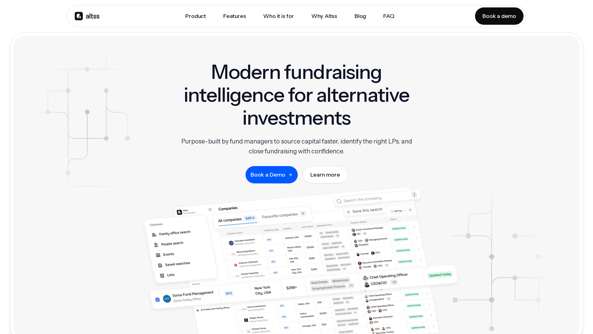 Altss positions itself as an OSINT-powered, real-time intelligence engine designed to speed fundraising, LP discovery, and deal sourcing in private markets. The platform emphasizes continuous signals from public sources—such as team moves, fund launches, co-investments, hiring, and filings—to surface timing and intent rather than relying on static historical profiles. Core capabilities include OSINT-powered signals, live fund discovery, and LP profiles with verified contacts and inbox-ready emails, plus broad family-office coverage. Data hygiene workflows provide change detection and regular re-verification cadences, with premium datasets, API access, and enterprise features mentioned in product copy. Site coverage notes large reach (references around 1.5M LP contacts and >$2T AUM in FAQ and blog references). Pricing is described as an annual subscription with a flat team-wide entry point (roughly $15,500/year) but pricing pages are inconsistent or unavailable. Terms of Use describe annual upfront payments, automatic renewal, and restrictions on scraping and data export. A reported free trial appears in some posts but is not clearly exposed on pricing pages. Given missing pages and mixed snippets, direct confirmation from sales is recommended to finalize pricing, plan features, seat vs. team billing, and data licensing. Recommended next steps include booking a demo and requesting a coverage sample from sales.