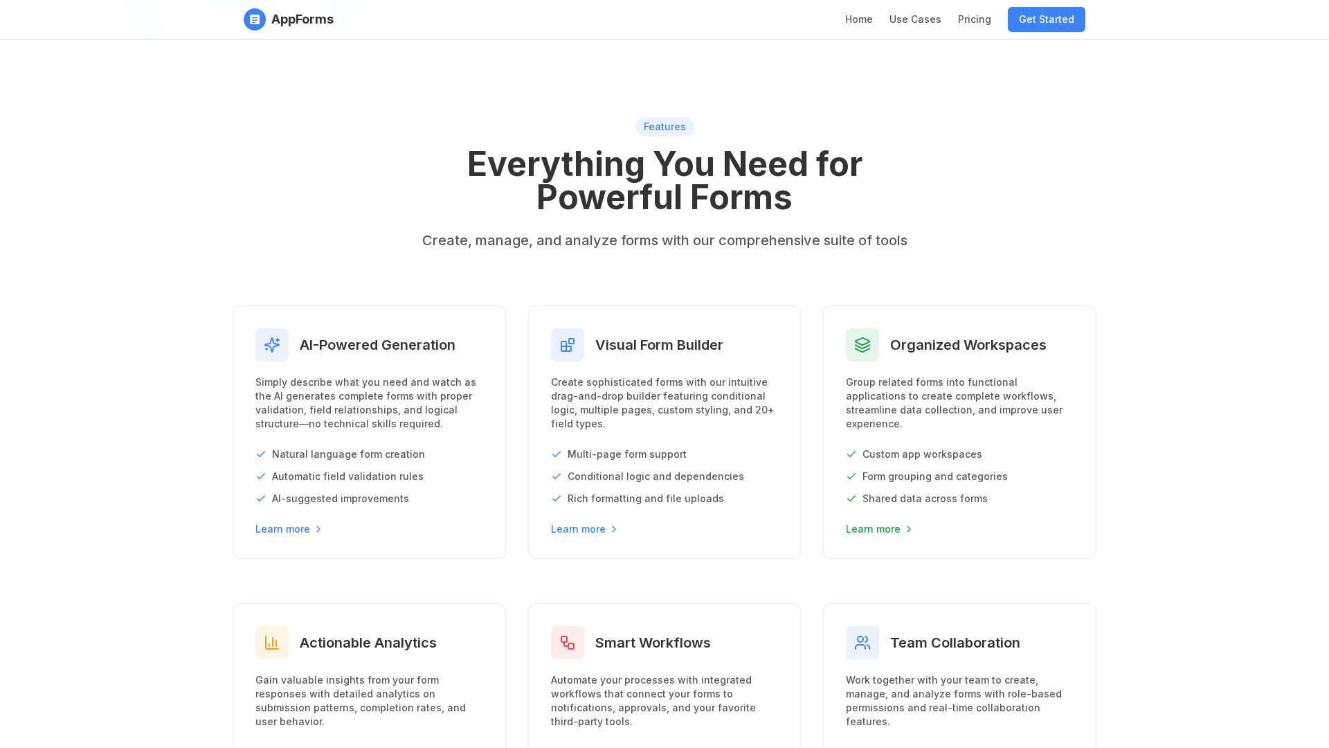 AppForms is a web-based form platform that enables AI-generated form creation with a visual drag-and-drop builder, multi-step/conditional forms, automations and team/workspace features for no-code workflow automation. Core value centers on AI-assisted form creation plus a visual builder, with support for conditional logic, file uploads, and integrated workflows. The product offers workspaces to organize forms, real-time analytics on responses (including completion times and device/browser breakdowns), and robust enterprise features (white-labeling, SSO, audit logs, data-retention controls, custom integrations and training). Use cases include healthcare, education, HR, marketing, financial services, and more, with HIPAA-compliant flows mentioned for healthcare scenarios. Pricing includes Free, Professional, Business, and Enterprise options, plus a free tier and trial. The site notes some content gaps on /features (404) but pricing, privacy, terms, and use-cases are accessible.