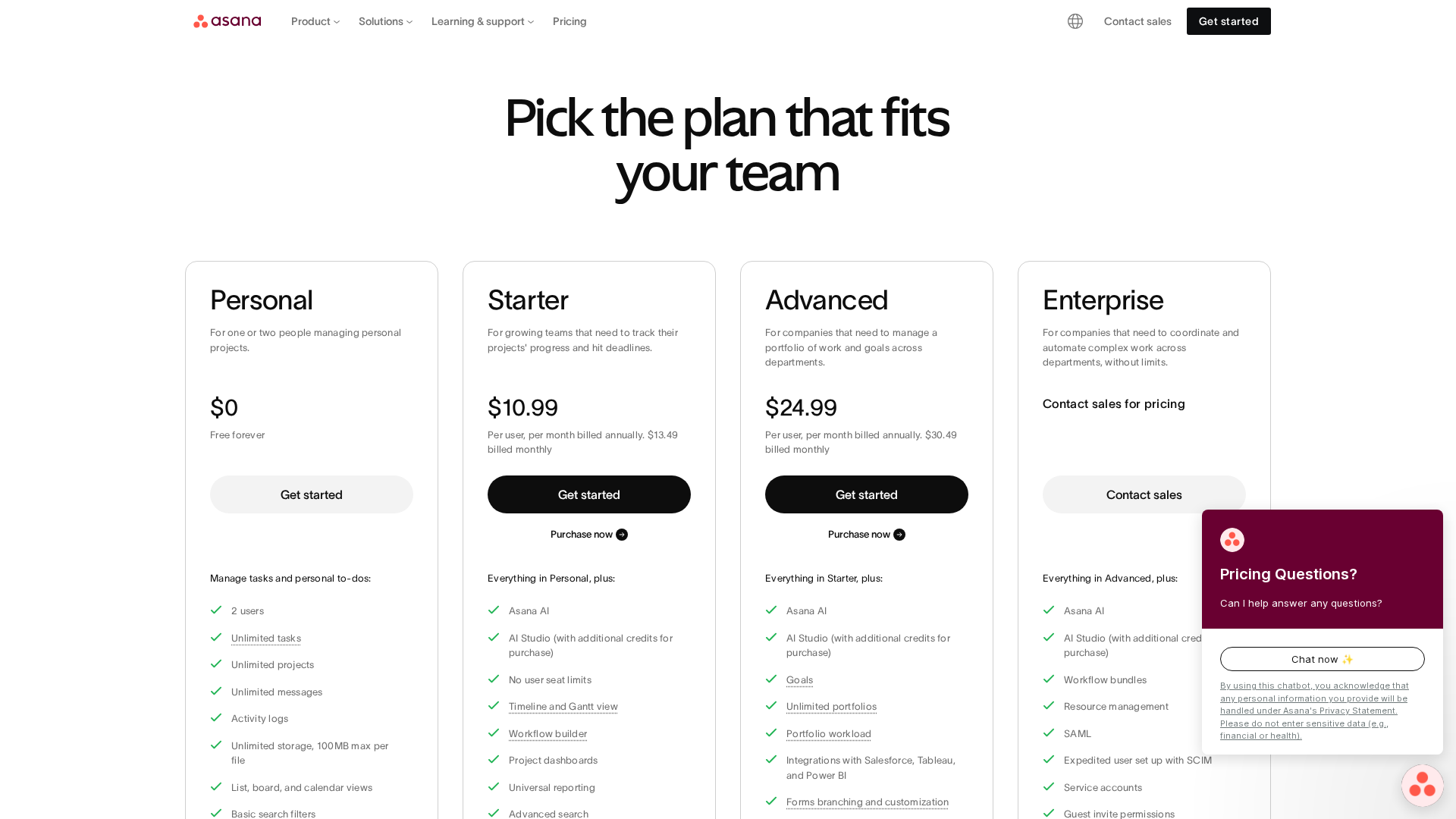 Asana is a cloud-based work and project management platform designed to help teams organize, track, and execute work at scale. Built around a Work Graph model, Asana connects tasks, projects, goals, timelines, and people to give organizations visibility into who is doing what and when. The product supports multiple views (list, board, timeline/Gantt, calendar), powerful automations and no-code workflow building, robust reporting and dashboards, and a growing suite of AI-powered features (AI Studio for workflow assistance and content generation). Asana scales from single users and small teams on a free Personal tier up through Starter, Advanced, and Enterprise/Enterprise+ plans with governance, compliance, and security controls for large organizations.