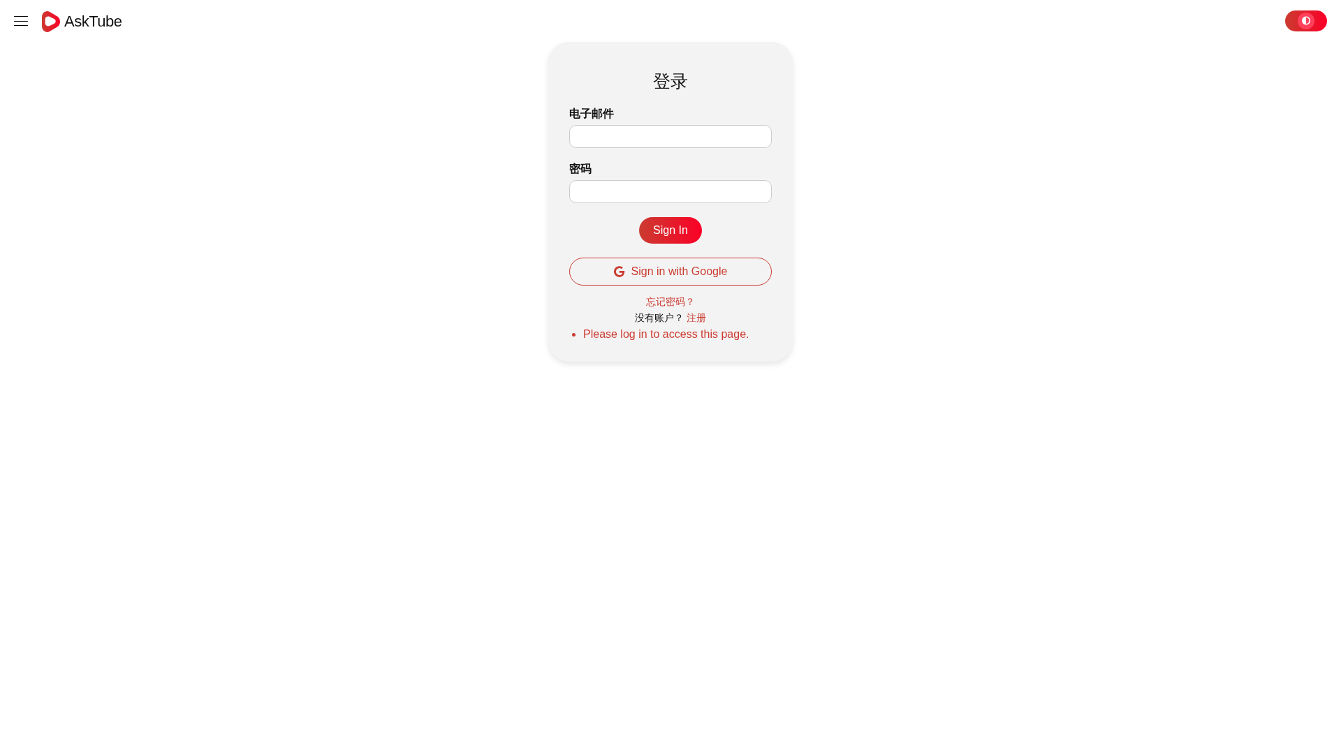 The press page prompts sign-in or registration to access AskTube.Ai's content.