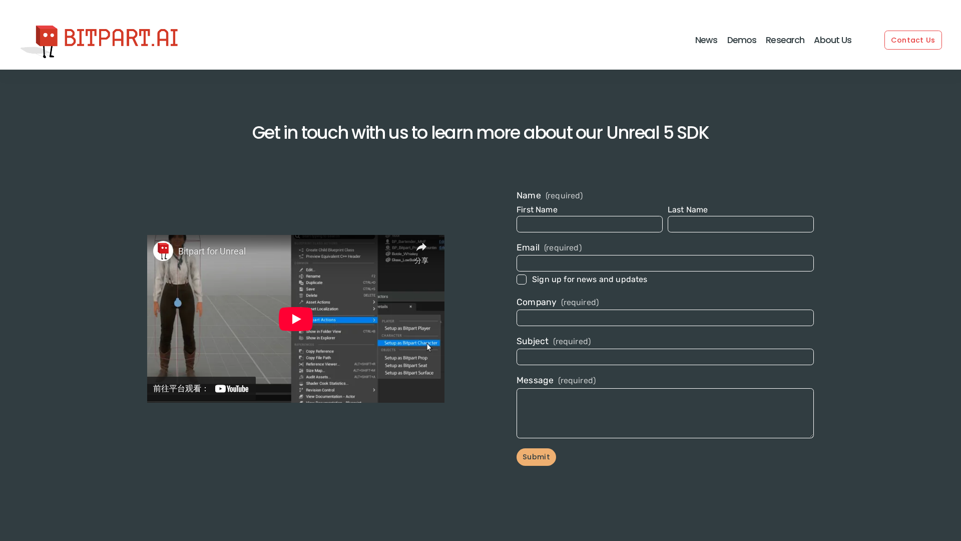 Teaser landing page inviting inquiries about Bitpart AI's Unreal 5 SDK.