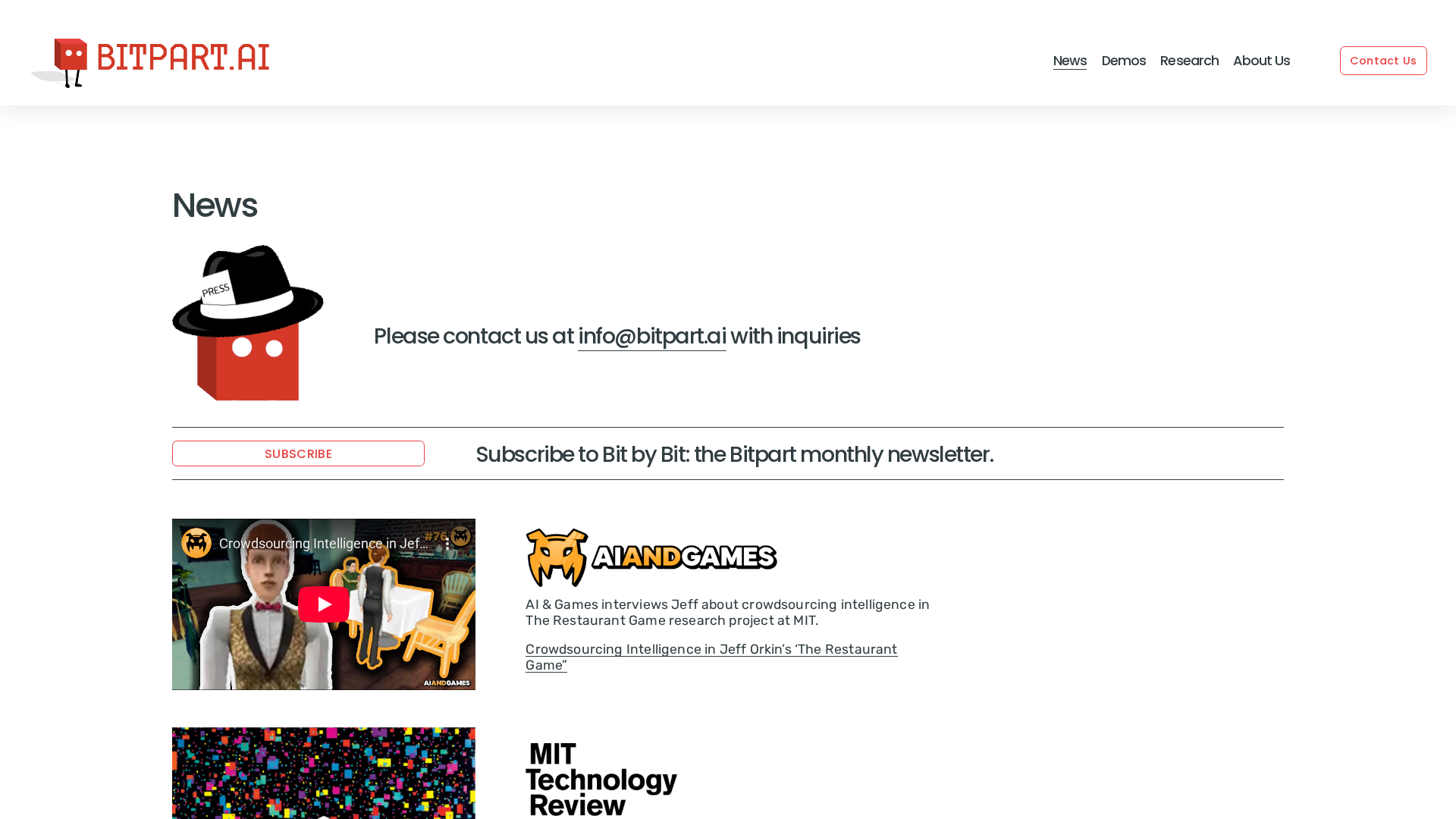 Bitpart AI provides an end-to-end AI character engine intended to power embodied, world-aware NPCs and multi-agent interactions for games, film/TV/animation, training, and commercial use. Public site content highlights an AI Director that coordinates multi-agent interactions, episodic planning/HTN-based planning informed by human data and LLM-generated narratives (research lineage referencing GOAP and related academic work), a library of game-ready Actions, Props, and Archetypes, memory-enabled interruptible characters with personality traits, authoring tools aimed at non-programmers (text-based rehearsal and optional LLM assistance), script-to-scene/text-to-cinematic features for instant previsualization and casting, and announced SDKs/editor integrations (explicitly Unreal 5; mentions of Unity and Roblox and source for proprietary engines). Site pages found include Homepage, About Us (founders: Jeff Orkin (CEO) and Sarah Rudzki (CPO) and advisors board mention), Research (technical background), Demos (including Unreal demo and multi-agent episodes), an Unreal SDK landing page (call-to-action to contact sales), News (company news, demos, newsletter signup “Bit by Bit”; sales contact info listed), and a Privacy Policy (updated Jan 3, 2025; lists [email protected] for privacy/data-rights requests). Several expected public pages were missing/404 (contact, pricing, features, docs), and no public pricing or developer docs were available from the site crawl. Contact emails published on the site: [email protected] (news page) for inquiries and [email protected] (privacy policy) for privacy/data-rights requests. Recommended next steps from the site crawl include contacting sales for pricing/licensing, requesting access to SDK documentation and sample projects, requesting a demo or technical call to review the Unreal Editor plugin workflow and cross-engine export/deployment, asking for developer docs and integration pipelines, subscribing to the newsletter, and contacting support for legal/privacy details.