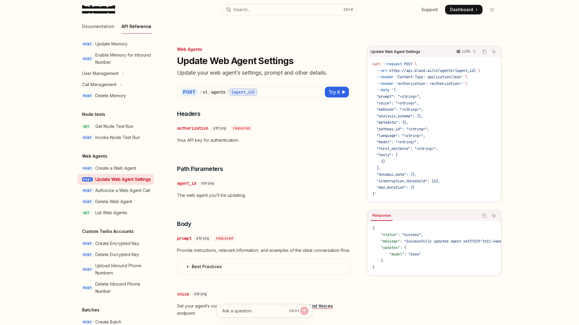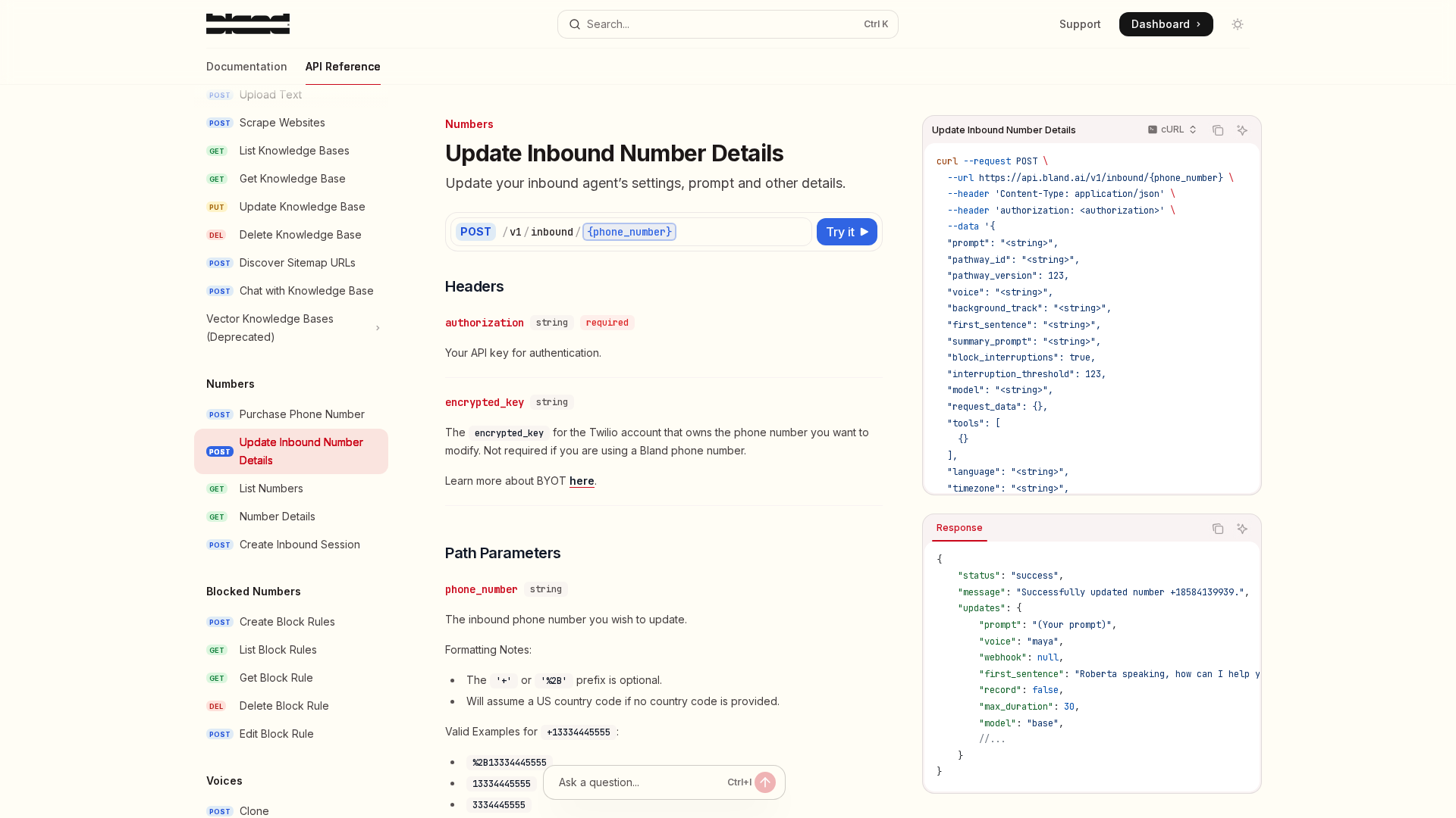 Documentation for updating inbound number settings via Bland AI API, covering authentication, path/body parameters, prompts, voices, and call settings.