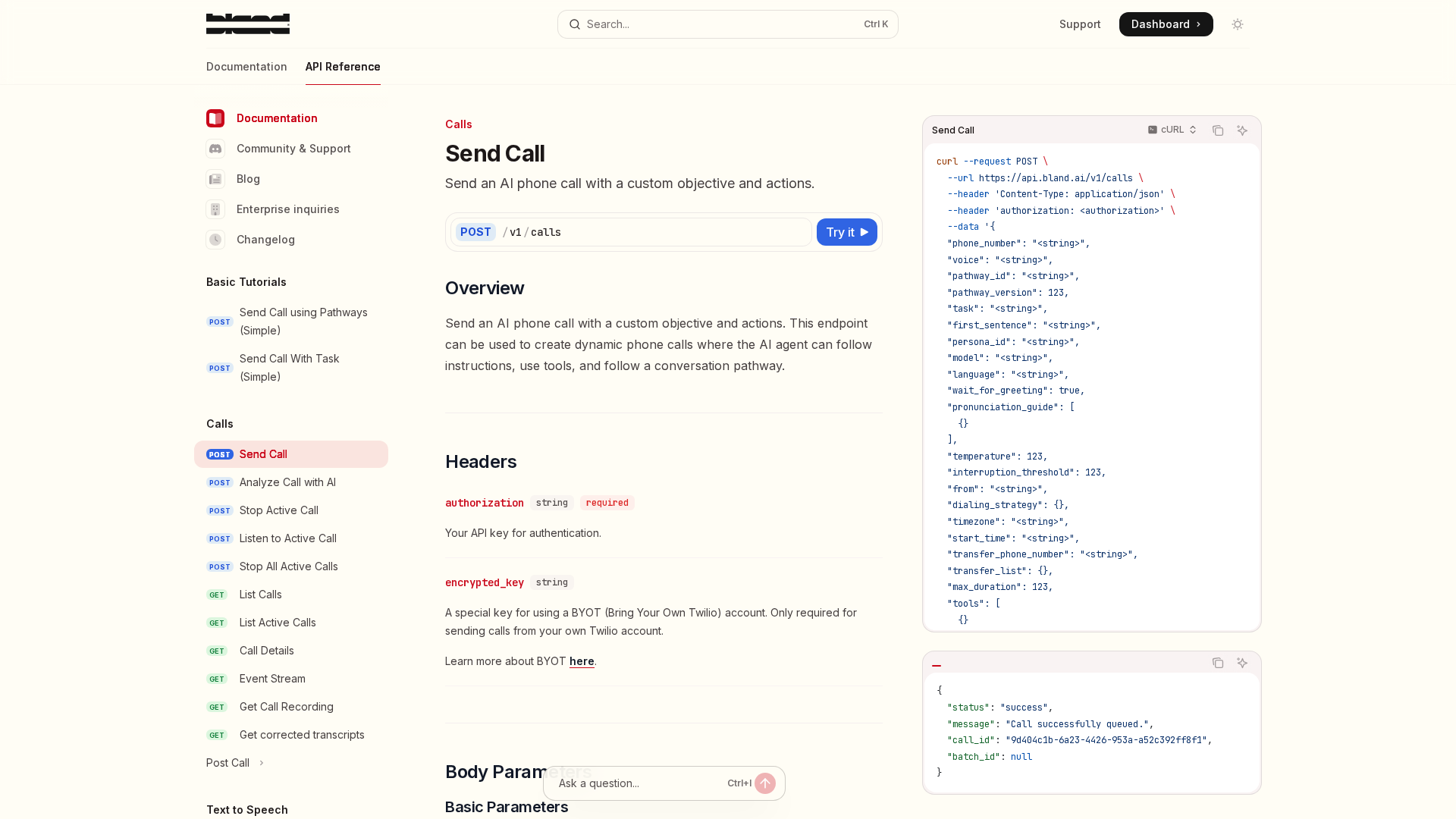 A comprehensive guide to Bland AI's Send Call API for customizable outbound AI phone calls.