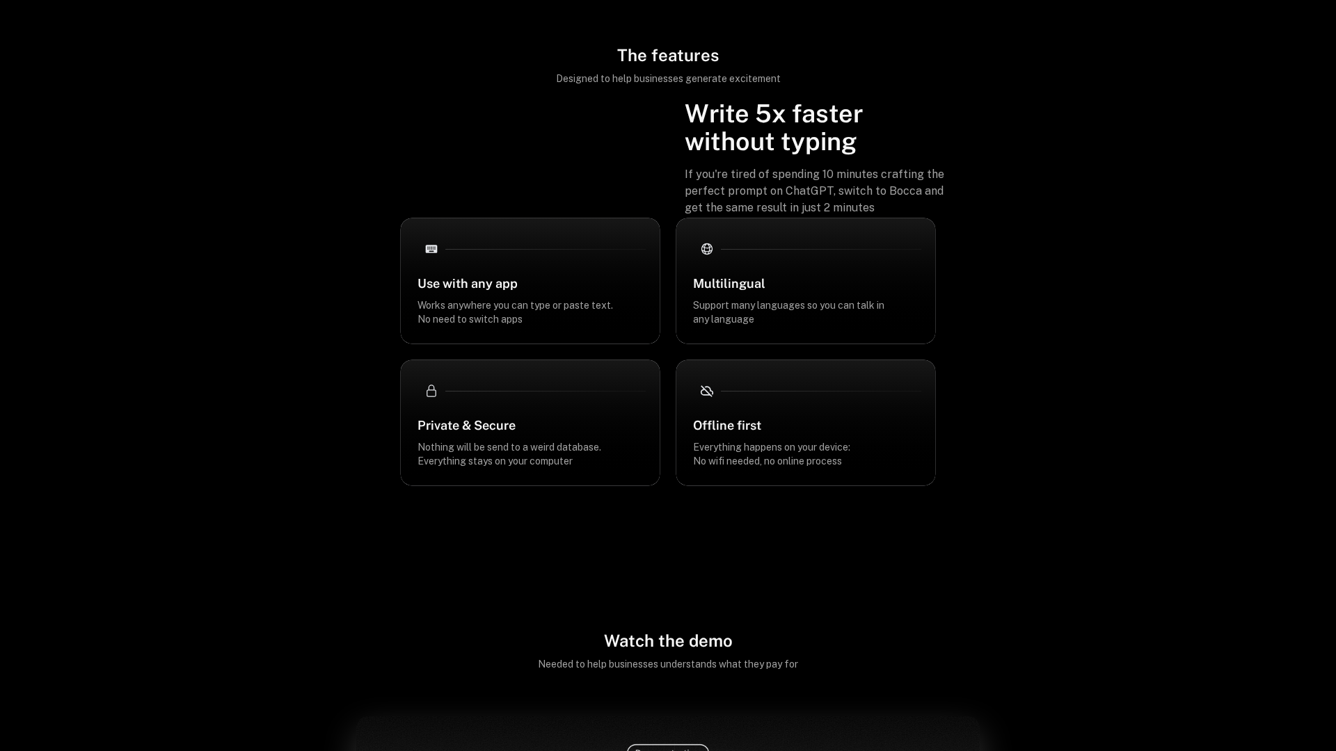 Bocca is an on-device, offline AI tool for transcription and prompt-generation designed for professionals and content workflows. Privacy is emphasized because transcription occurs locally on the device with no cloud processing. Based on the homepage and Product Hunt, Bocca provides push-to-talk in any app via a global shortcut, transcribes audio (and video) to text, lets you choose AI models (Whisper-based), supports multilingual transcription with accents and dialects, and offers export workflows for content creation. It operates offline/on-device with low latency and privacy protections. Platform focus is macOS per Product Hunt, with no Windows or Android plans announced; a stable download page or App Store entry is not clearly available on bocca.dev due to several 404s. Pricing highlights include a Free plan ($0) with 50 transcriptions per month and a Premium one-time payment of $25 for unlimited transcriptions; pricing pages across the site appear inconsistent or missing. The Product Hunt listing corroborates offline operation, Whisper models, macOS focus, and community feedback. Unresolved questions include system requirements, official download method, refund policy, and enterprise/licensing options.