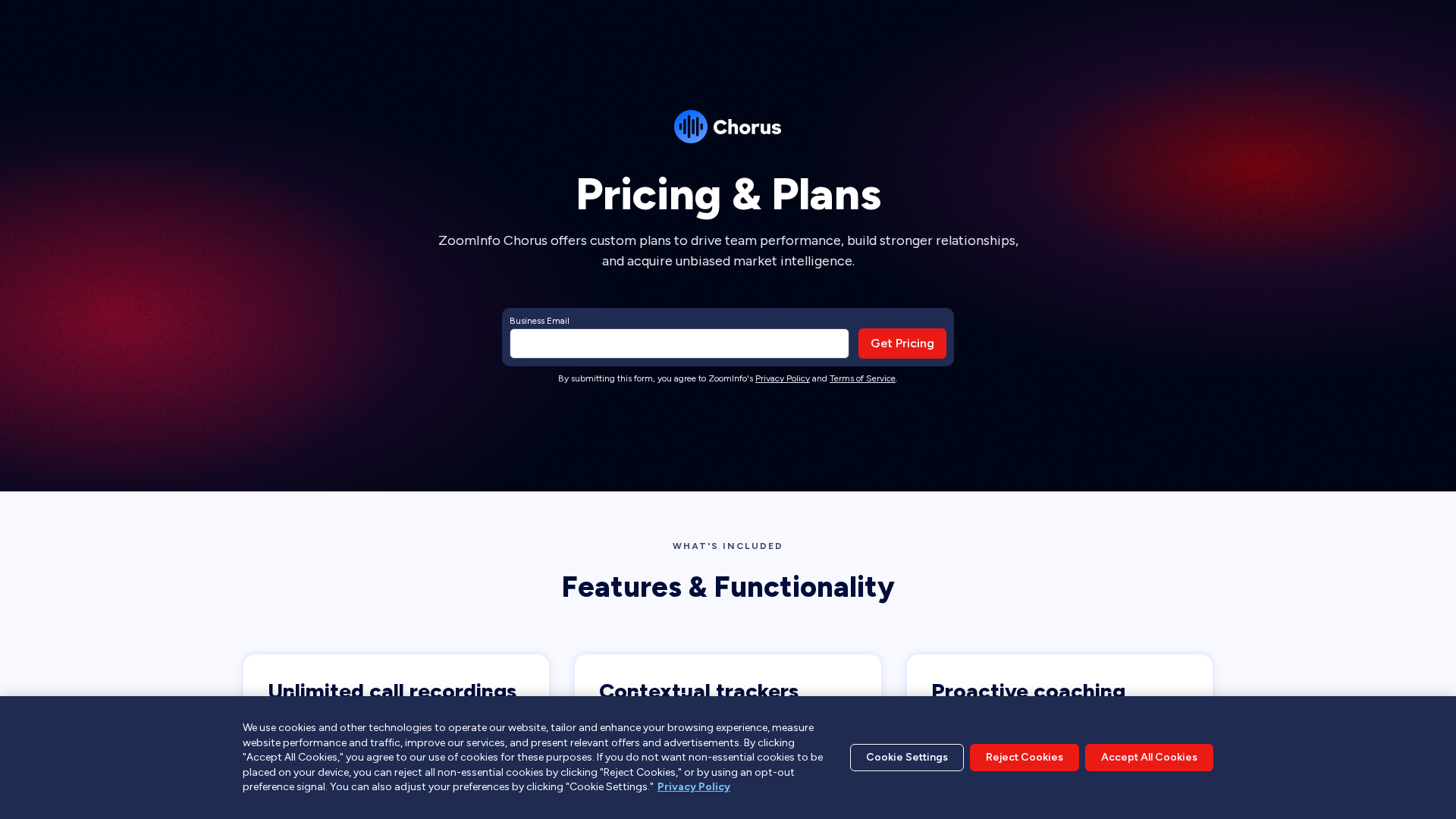Chorus (acquired by ZoomInfo in 2021, reported acquisition price $575M) is a conversation intelligence platform that captures and analyzes sales calls, meetings and emails to surface coaching moments, deal insights, searchable transcripts, sentiment/topic analysis, and forecasting signals. It is positioned to help revenue teams improve rep coaching, shorten ramp time, increase win rates, and surface voice-of-customer insights. Key capabilities and site findings: transcription and searchable transcripts; moment extraction (coaching moments, objections, win/loss drivers); deal intelligence and forecasting signals; coaching workflows and dashboards; CRM sync and many third-party integrations (Zoom, Salesforce, sales engagement platforms); and an API with endpoints for Conversations, Transcripts, Deals, People, Teams, plus auth and webhooks for integrations. The public pricing page does not list per-seat or per-month prices — Chorus uses tiered/enterprise/custom pricing and asks prospects to contact sales or request a demo for quotes. Operational notes: the /about page returned an S3 NoSuchKey error at the time of collection; mobile site references exist (m.chorus.ai); the site provides blog resources and playbooks. Recommended next steps include requesting a demo for pricing and enterprise quotes, reviewing API docs for integration details and rate limits, checking marketplace connectors for integration validation, and requesting SOC2/compliance and data-residency info from sales for governance/security concerns.