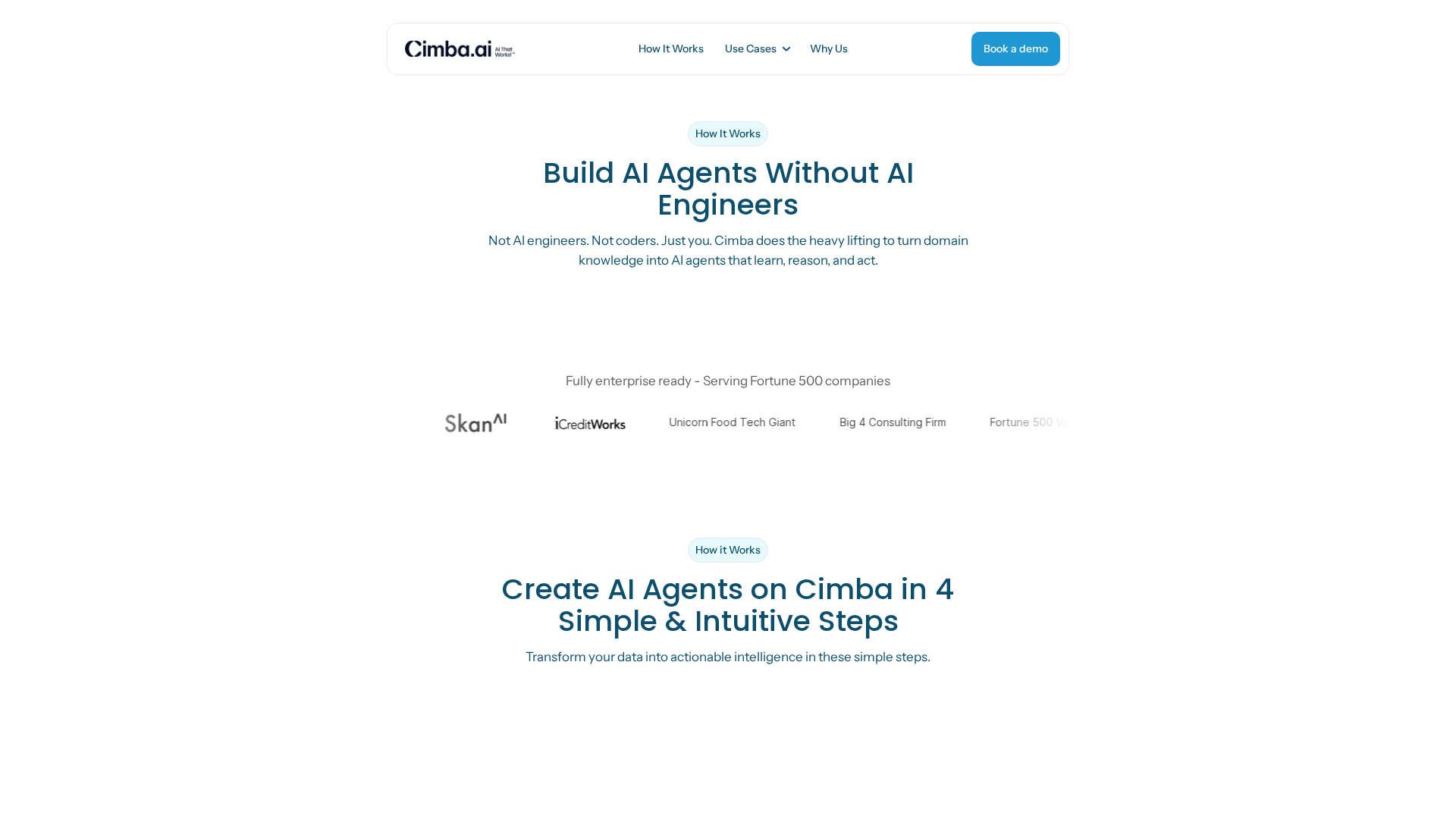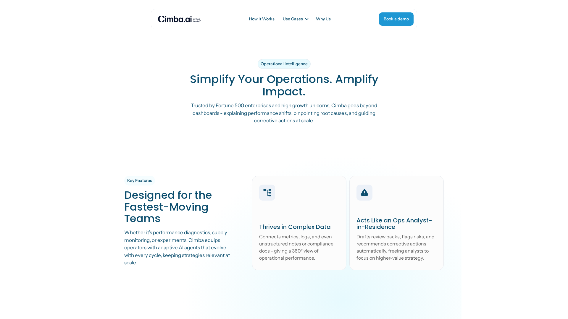 Cimba.AI is a no-code enterprise platform for building, training, and deploying domain-specific AI agents. It enables business analysts and domain experts to create agents that ingest enterprise data, explain metric movements, recommend actions, and take guarded automated actions (e.g., CRM/ERP updates, emails). The platform emphasizes rapid time-to-value (first agent in under a week), adaptive learning (agents improve with each interaction), enterprise-grade security and governance (SOC-2, RBAC, row/column-level security, in‑VPC and cloud-agnostic deployment), and auditability for regulated workflows. Cimba targets large organizations (Fortune 500, Big 4) and focuses on Finance, Customer Success/Growth, and Operations use cases. Public site content includes use cases, case studies, and product explanations; explicit pricing, public plans, or self-serve tiers are not listed (site directs visitors to contact/book a demo). Documentation and community pages were not found publicly.