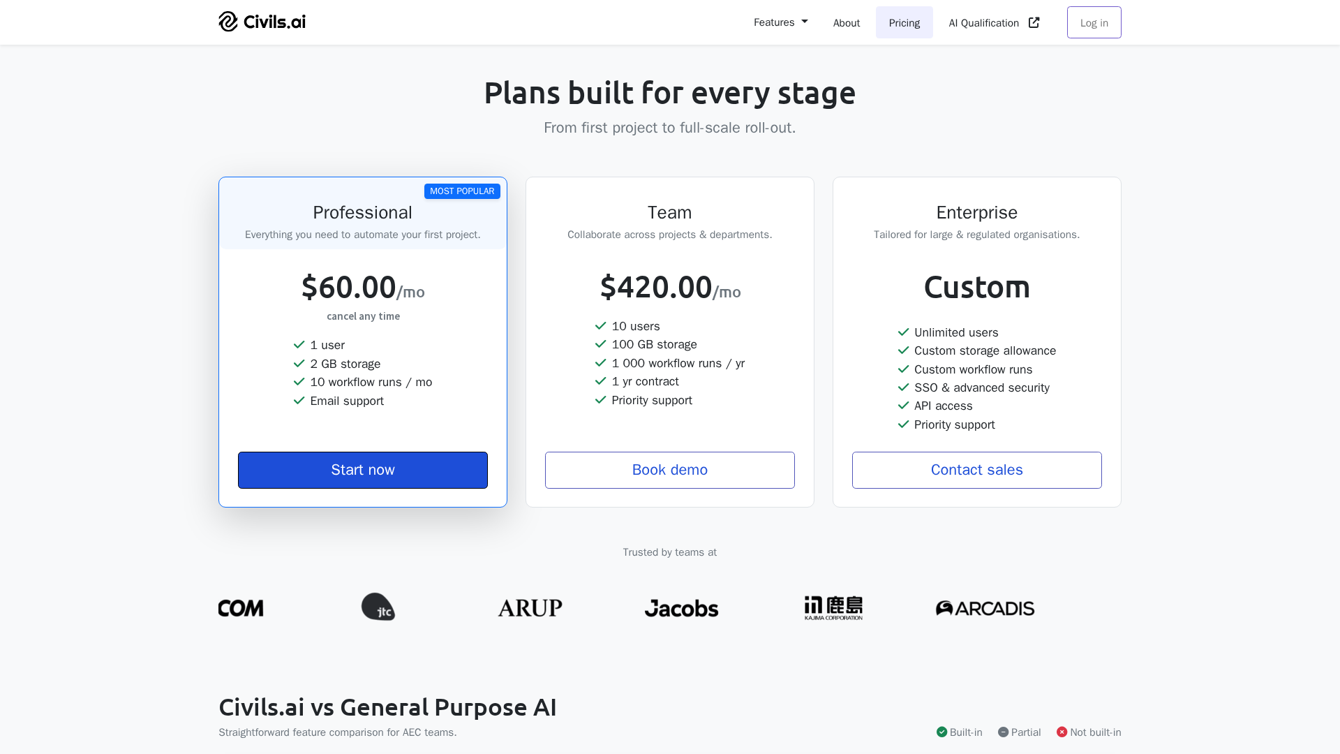 Overview of Civils.ai pricing, plans, and AEC-focused features, with a clear comparison to general AI capabilities.