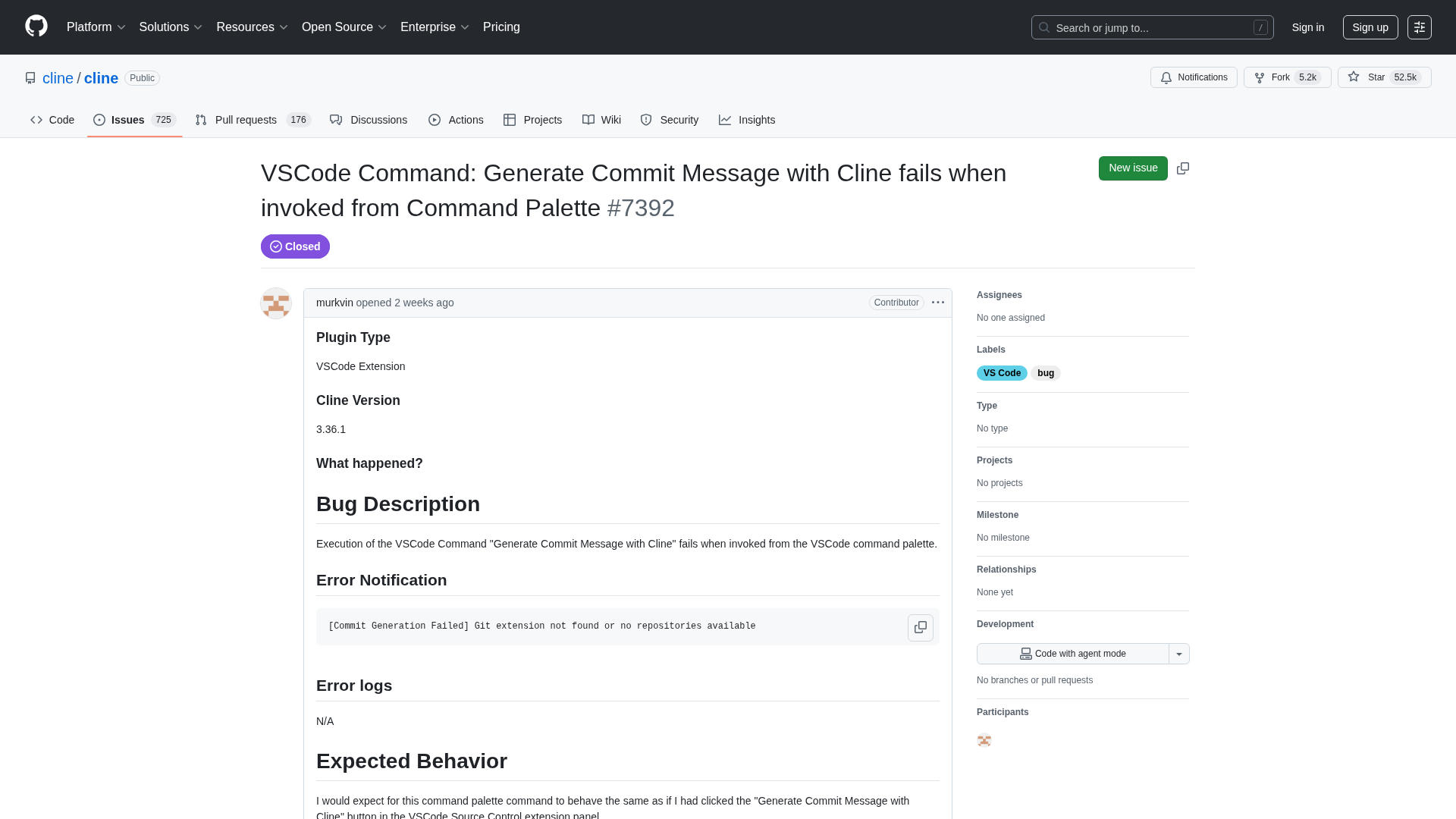 Bug: cline's 'Generate Commit Message with Cline' fails when run from the VSCode Command Palette.