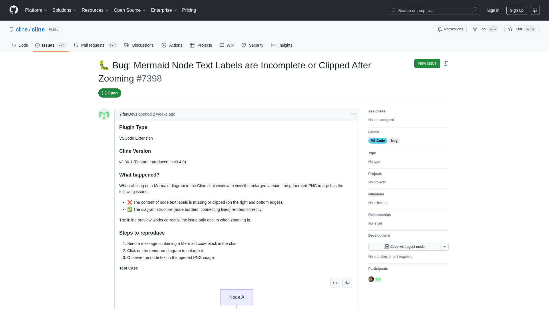 A bug in Cline’s VSCode extension causes Mermaid node text to be clipped when zooming diagrams due to foreignObject rendering during SVG-to-PNG export.