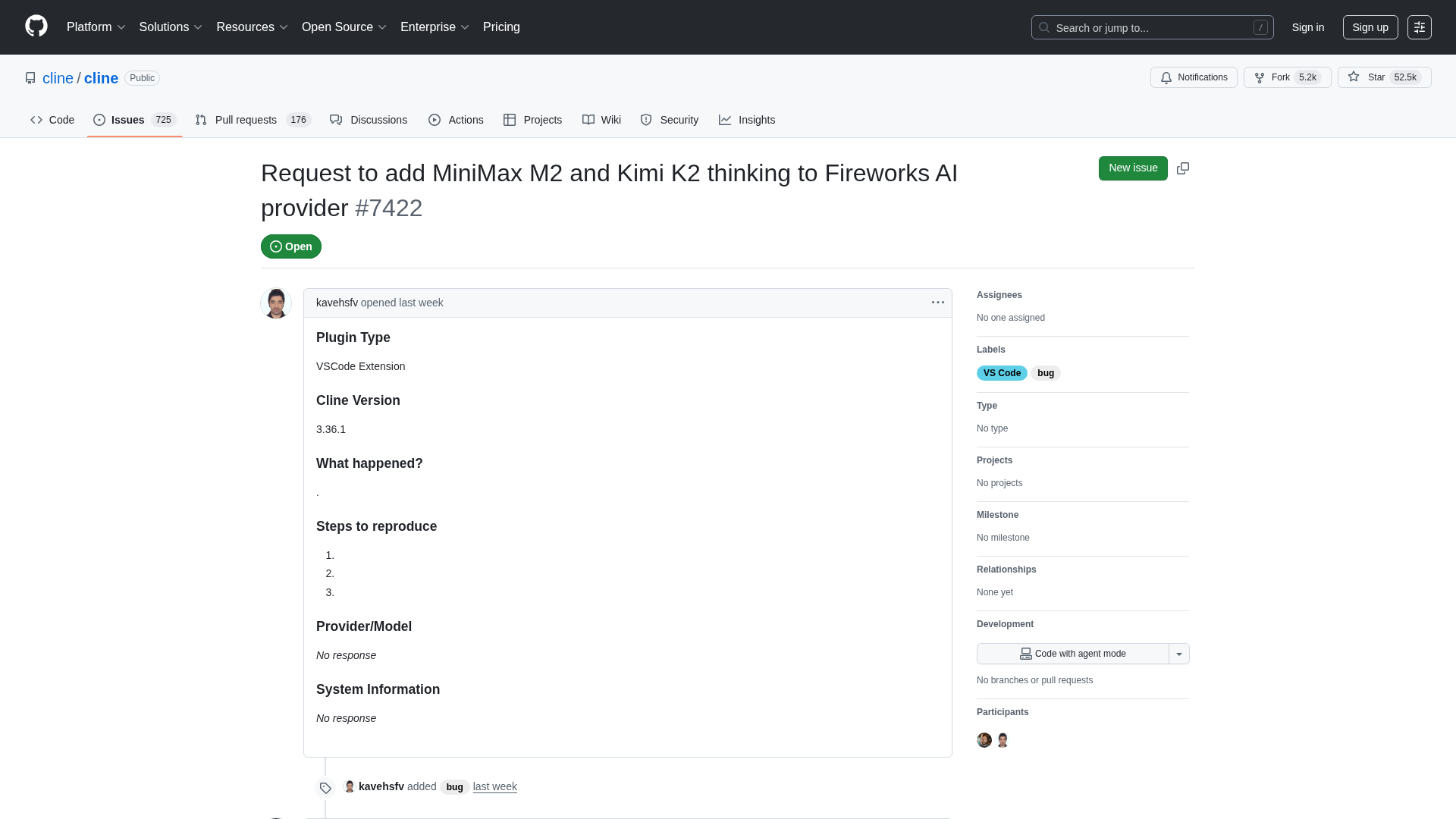 A feature request to add MiniMax M2 and Kimi K2 thinking models to the Fireworks AI provider in Cline's VSCode extension.