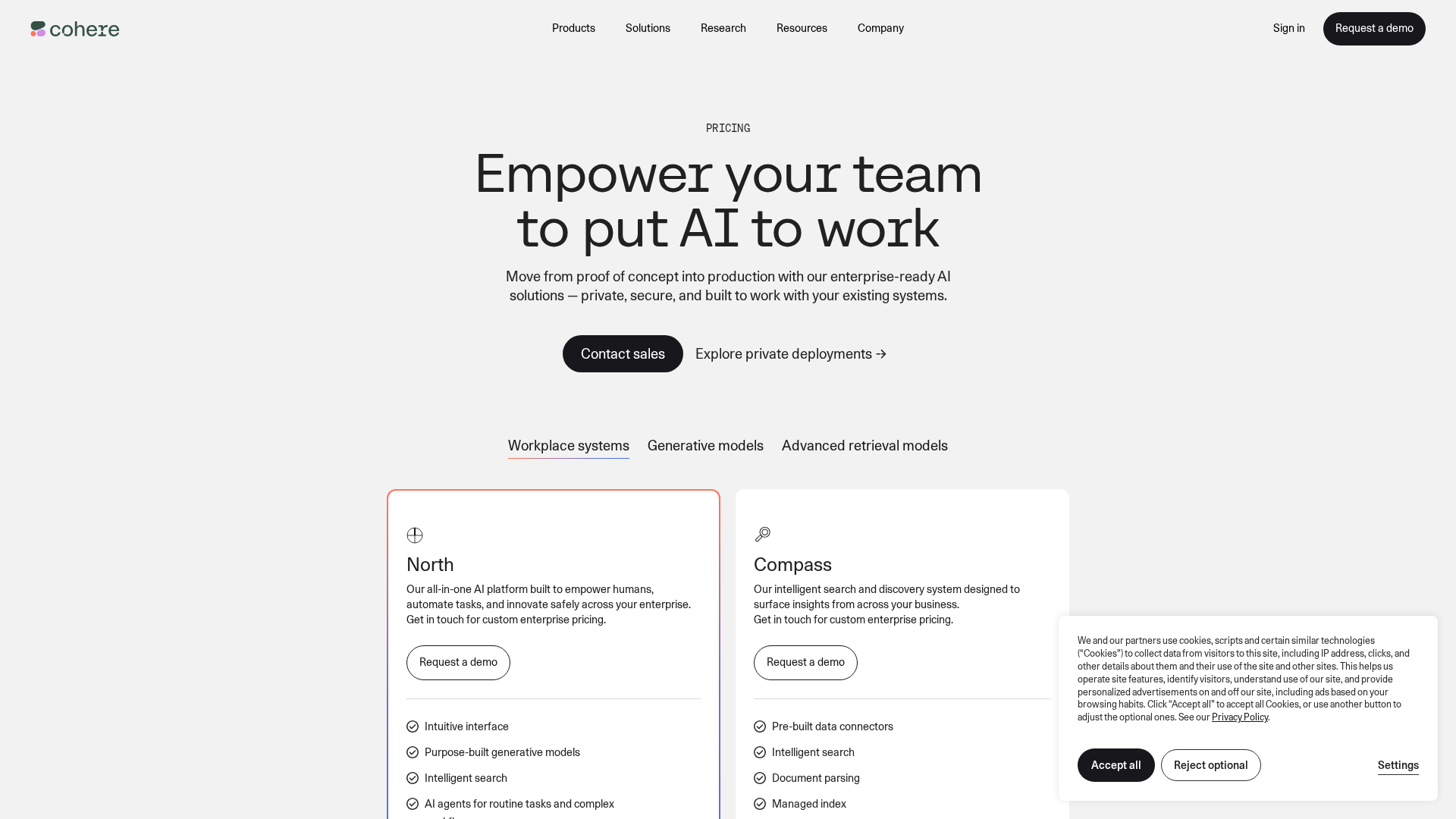 Custom enterprise pricing for products such as North and Compass, and for dedicated/private deployments. Contact sales or request a demo for pricing and deployment details.