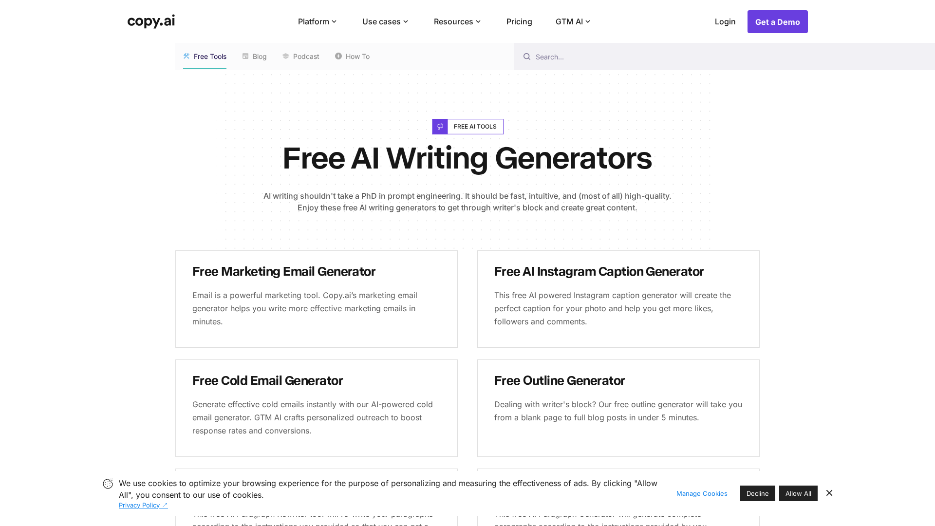 A hub of free AI writing tools from Copy.ai designed to boost content creation and marketing outcomes.