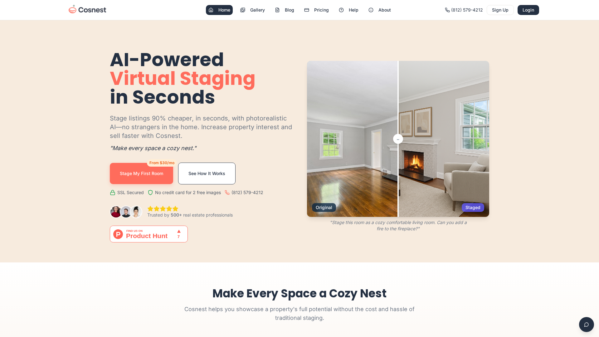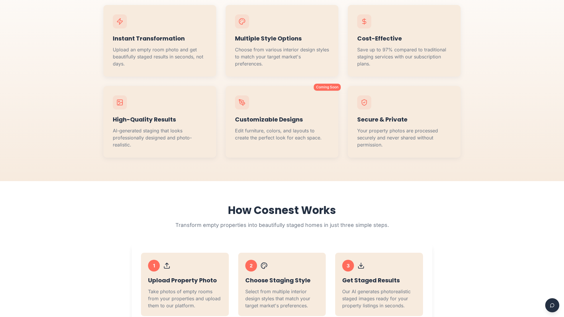 Cosnest is an AI-powered virtual staging platform designed for real estate professionals, photographers, property managers, and teams. It transforms photos of empty or under-furnished rooms into photorealistic, fully furnished interiors in seconds. The platform supports multiple room types (living rooms, bedrooms, kitchens, etc.) and offers style presets (modern, minimalist, luxury) with automatic furniture placement that accounts for perspective, shadows, and lighting. Users can generate multiple iterations for A/B testing, batch process large sets of listings, and export high-resolution images suitable for MLS, brochures, and social media. Private galleries are available for paid plans, while a public gallery is accessible in the free tier. Team collaboration and enterprise options exist for higher quotas and custom workflows. Integrations and export options align with typical MLS/CRM workflows. Pricing includes a free tier, subscription plans, and pay‑as‑you‑go credit packs, with enterprise customization available.