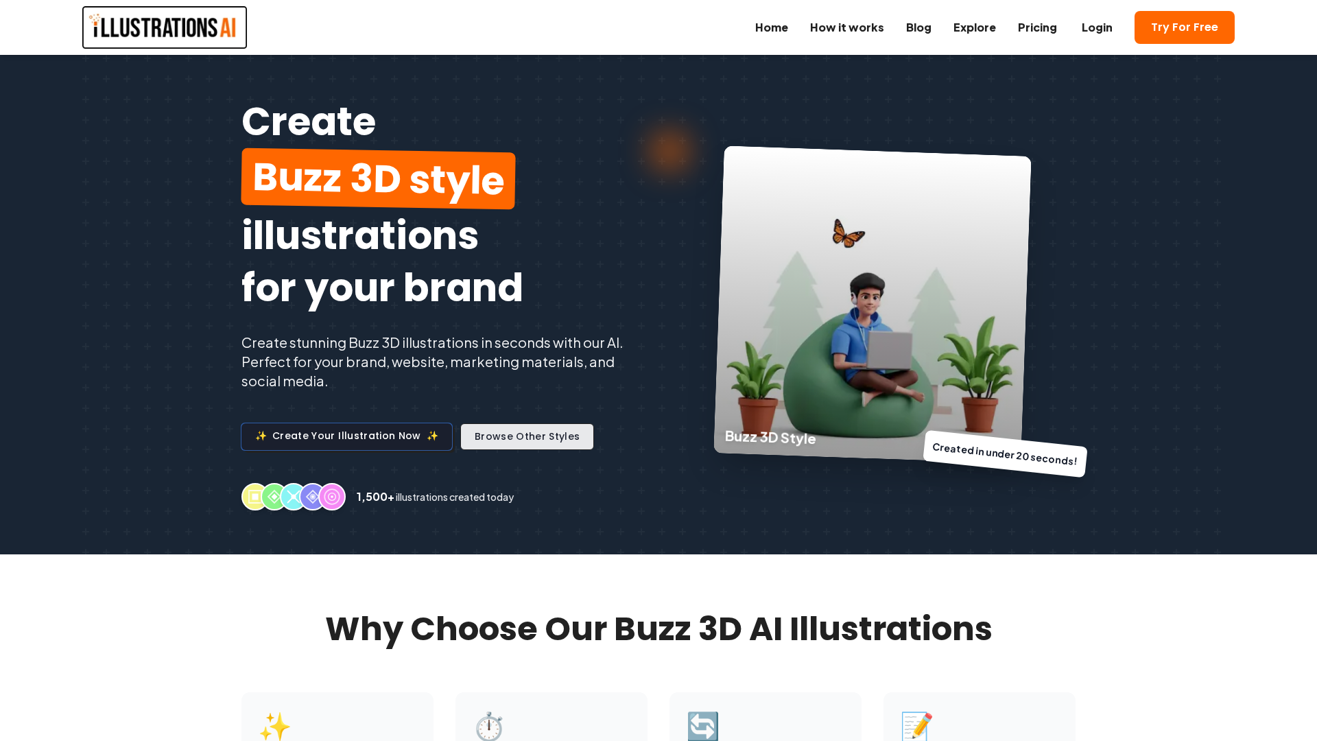 Buzz 3D (offered via IllustrationsAI.com) is an AI-powered illustration generator focused on producing high-quality, brand-consistent 3D-style illustrations quickly. Users provide a description (and optionally brand reference images) and the system returns multiple Buzz 3D illustration options within seconds, with the ability to iterate on prompts and generate many variations. Outputs are high-resolution and provided in editable formats suitable for Photoshop, Illustrator, and vector workflows. All generated assets are offered with commercial-use licensing, enabling immediate use in marketing, web, and product contexts. The service emphasizes speed, ease-of-use (no design skills required), and scalability for producing cohesive brand visuals at volume.