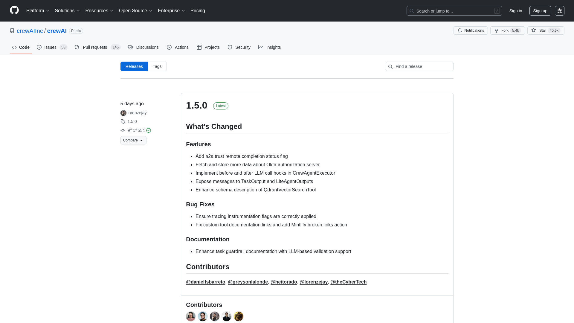 CrewAI 1.5.0 introduces LLM call hooks, expanded Okta data handling, improved tool schemas, and bug fixes with enhanced docs.