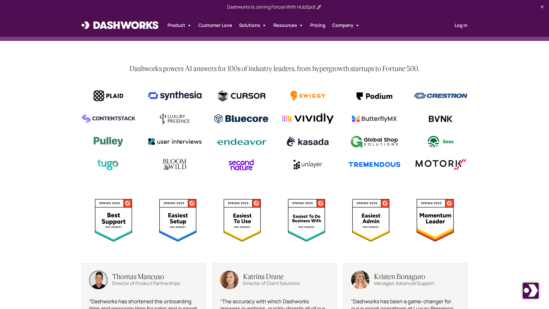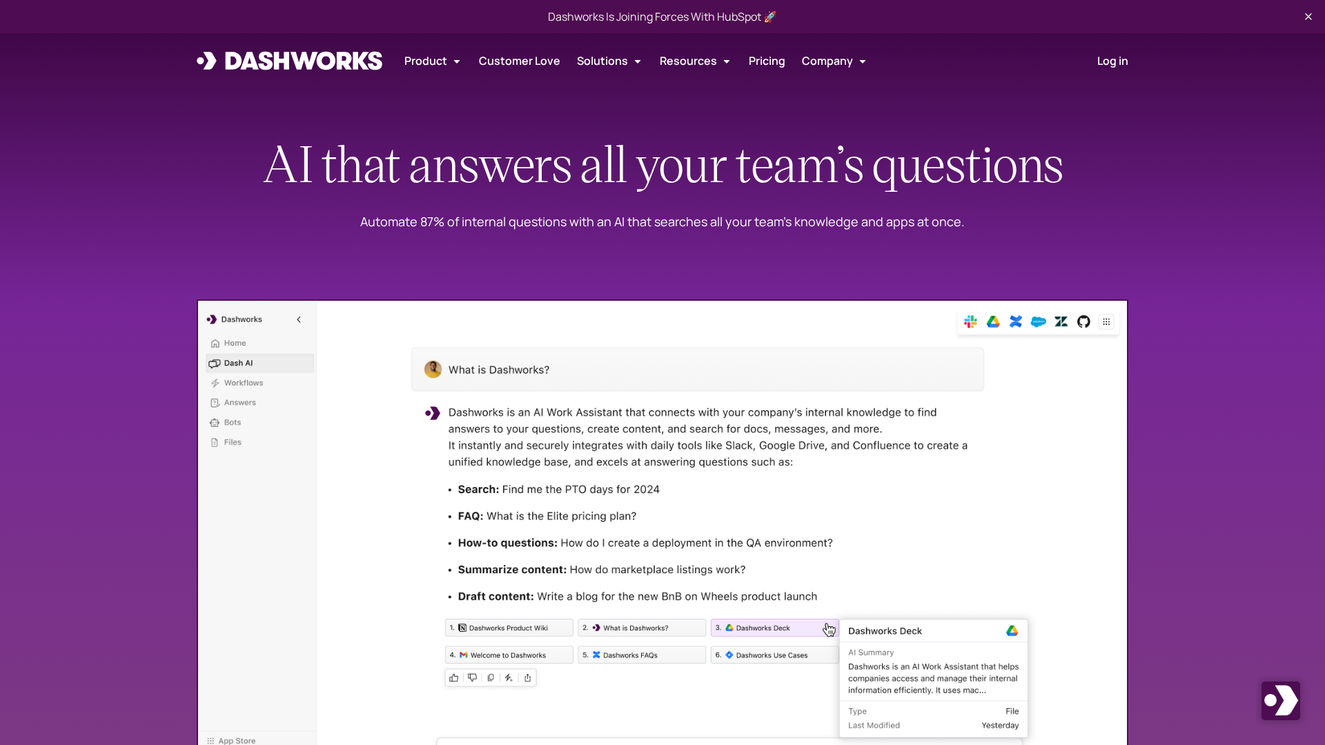 Dashworks provides an enterprise-focused omni-search AI assistant that connects to a company’s knowledge bases, apps, messaging, code, and documents to deliver instant, referenced answers and automate workflows. It offers customizable bots for teams, Slack automation, realtime search without long indexing, support for multiple LLMs (GPT-4o, Claude, Gemini Pro, Llama 3), enterprise-grade security controls (SSO/SCIM, custom data retention, zero-data retention options), and integrations across CRM, PM, wikis, code, and more. Dashworks targets teams across support, sales, product, and engineering to reduce response times, improve onboarding, and boost productivity.