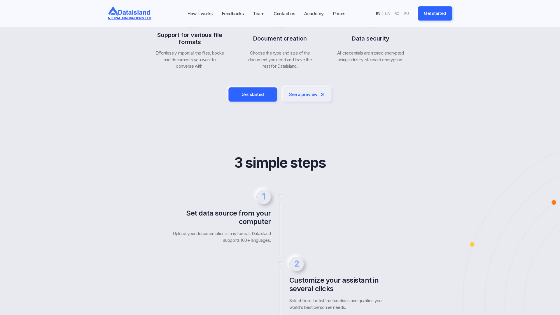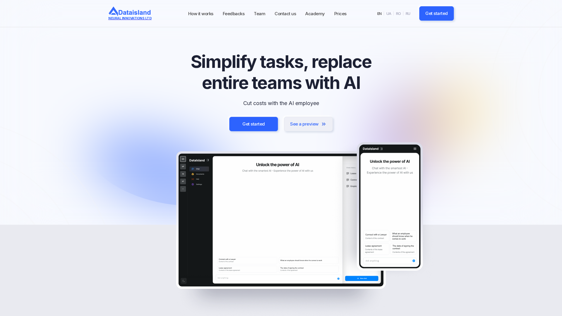 Dataisland is an "AI employee" platform that ingests documents (books, documents, uploaded file libraries) to train conversational/assistive AI agents that automate routine work, handle FAQs and customer support, and provide 24/7 assistance. The product is marketed to enterprises, universities, government services and similar organizations to reduce costs and scale operations. Key capabilities observed include multi-format document ingestion and training, quick customization of AI assistants, a file bank for business learning/training assistants, source-referenced answers from uploaded libraries, explanatory assistance to support critical thinking, and integrations with websites and CRM tools. Messaging integrations noted on the site include Telegram, Viber, Facebook Messenger and Instagram. The homepage claims support for 100+ languages and an onboarding flow described as three steps: upload data, customize assistant, deploy. Security and privacy information on the site and Privacy Policy (Neural Innovations Ltd.) states credentials are stored with industry-standard encryption, describes data collection/processing/retention and user rights (including GDPR/EEA/UK/Canada sections), and explains how to exercise data rights. The Privacy Policy and contract emphasize reasonable security measures but note no online system is 100% secure. Billing/contract information found on the Public Offer Contract (offer page, last updated May 3, 2024) indicates paid services and tariffs are referenced; payment operator named is LiqPay; access to paid features may take up to five business days after payment; recurring payments are automatic and refunds are generally not issued per the contract text; the seller in the contract is identified as Individual Entrepreneur Rafiev Tymur (Ukrainian registration and banking details provided in the contract). The offer references tariffs hosted at https://www.ni.solutions. The Privacy Policy lists Neural Innovations Ltd. as the data controller with regional representatives and contact options. Pages reviewed: homepage (product overview, features, integrations, onboarding), Public Offer Contract (/offer — terms, payments, seller identity, LiqPay, billing mechanics, refunds and tariff references) and Privacy Policy (/privacy — data processing, user rights, retention, security). No public, detailed pricing/tariff table was visible on the main site pages accessed; the offer suggests tariffs are available at ni.solutions. Recommended next steps include checking https://www.ni.solutions for tariffs, contacting sales via the site/contact/messaging channels for a price list or demo, and downloading/reviewing the full Offer contract and Privacy Policy for detailed legal and billing clauses.