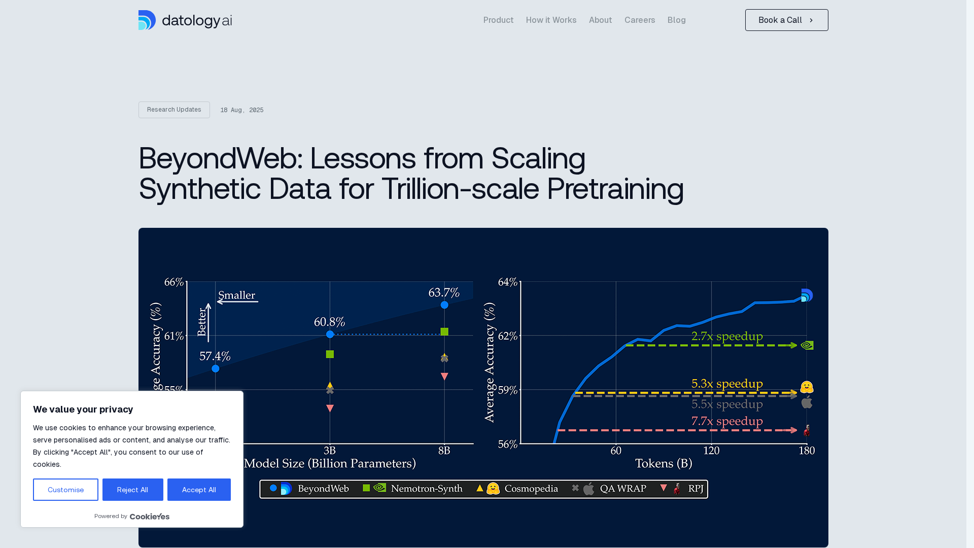 A rephrasing-based synthetic data pipeline (BeyondWeb) that improves trillion-token pretraining efficiency and accuracy across model scales.