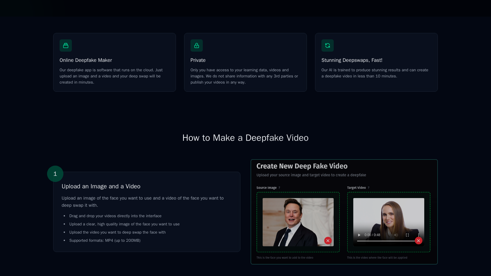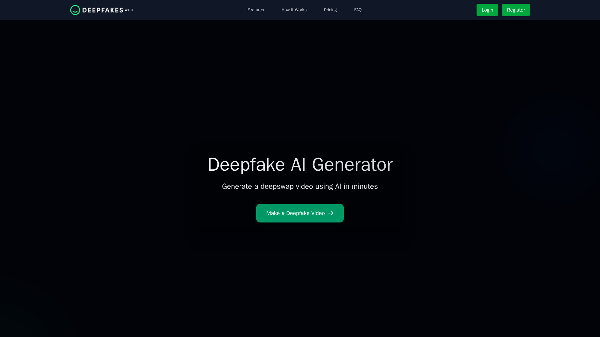 An online app gateway for creating deepfake videos, detailing features, how it works, pricing, and FAQs.