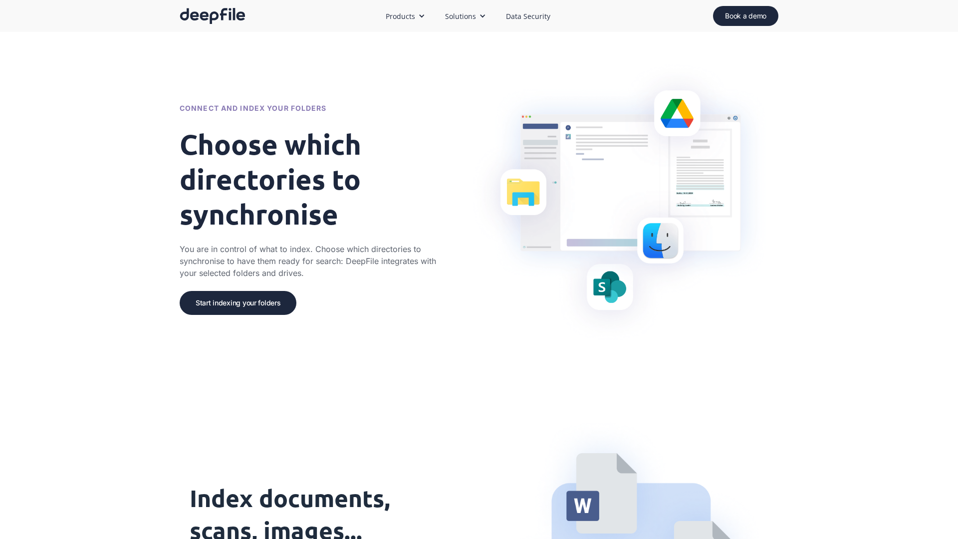 Users select exact folders/drives to index; DeepFile performs OCR on images and scanned PDFs so text becomes searchable.