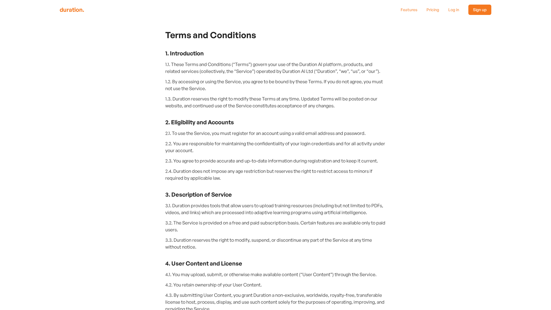 Duration positions itself as an AI-powered private tutor that builds personalized, adaptive learning plans in seconds. It supports multiple content formats (video, podcast, articles), interactive exercises/quizzes, continuous adaptation to learner goals/pace, and progress tracking. The homepage emphasizes AI-assisted personalized planning and ongoing progress monitoring. The platform logo is available as a favicon at https://www.duration.ai/favicon.ico. Pricing includes a free tier, freemium, and subscription models, with plans: Free, Pro, and Educators. The Terms page outlines IP ownership, account responsibilities, user content licensing, payment terms, and data protection references (UK GDPR). Some content (Docs and Features pages) returns 404, leaving missing details about features and developer resources. The terms also reference a contact email/address which should be retrieved directly from the Terms page.