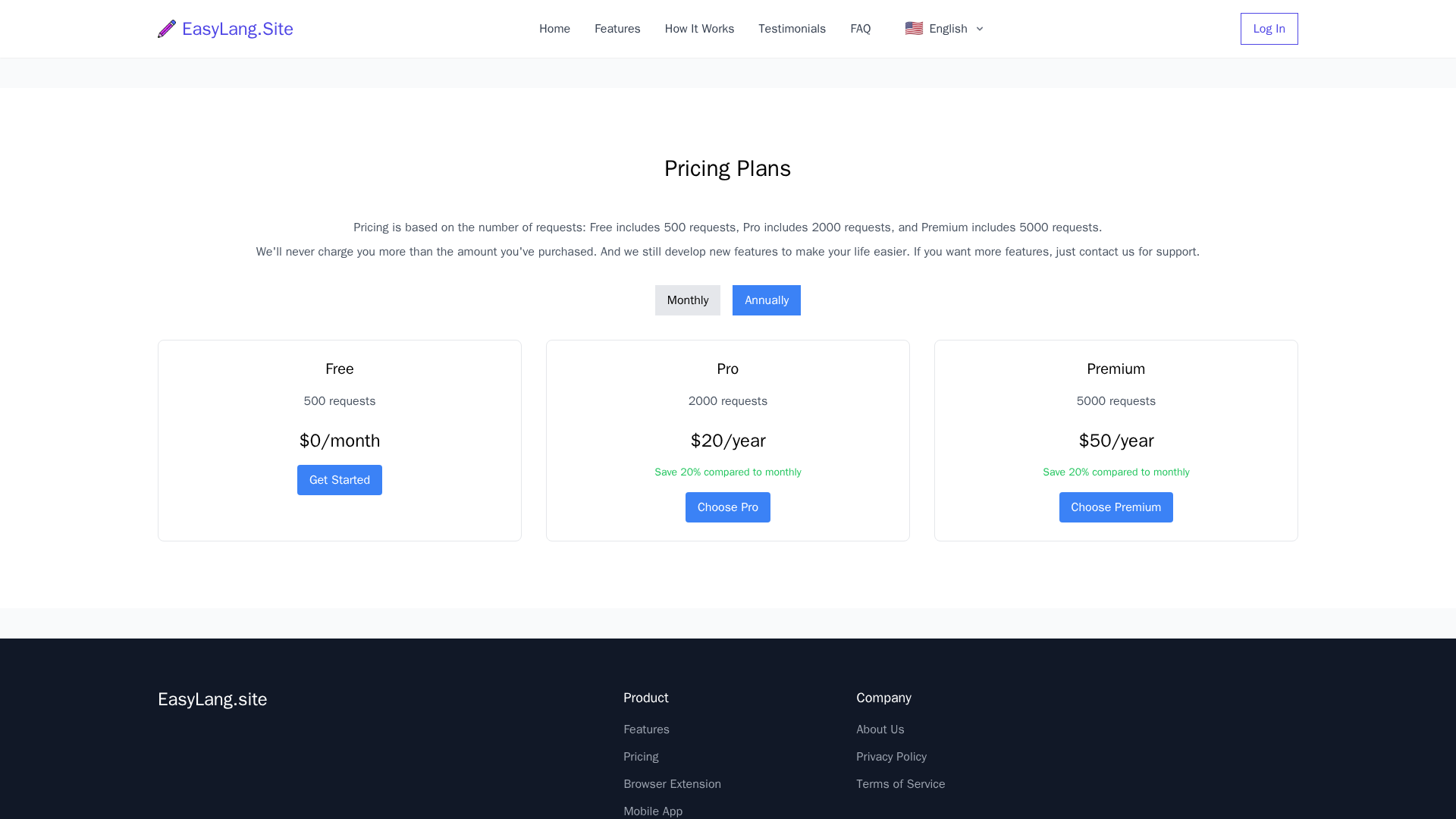 Premium plan with 5000 requests, billed yearly at $50 (annual billing offers ~20% savings)