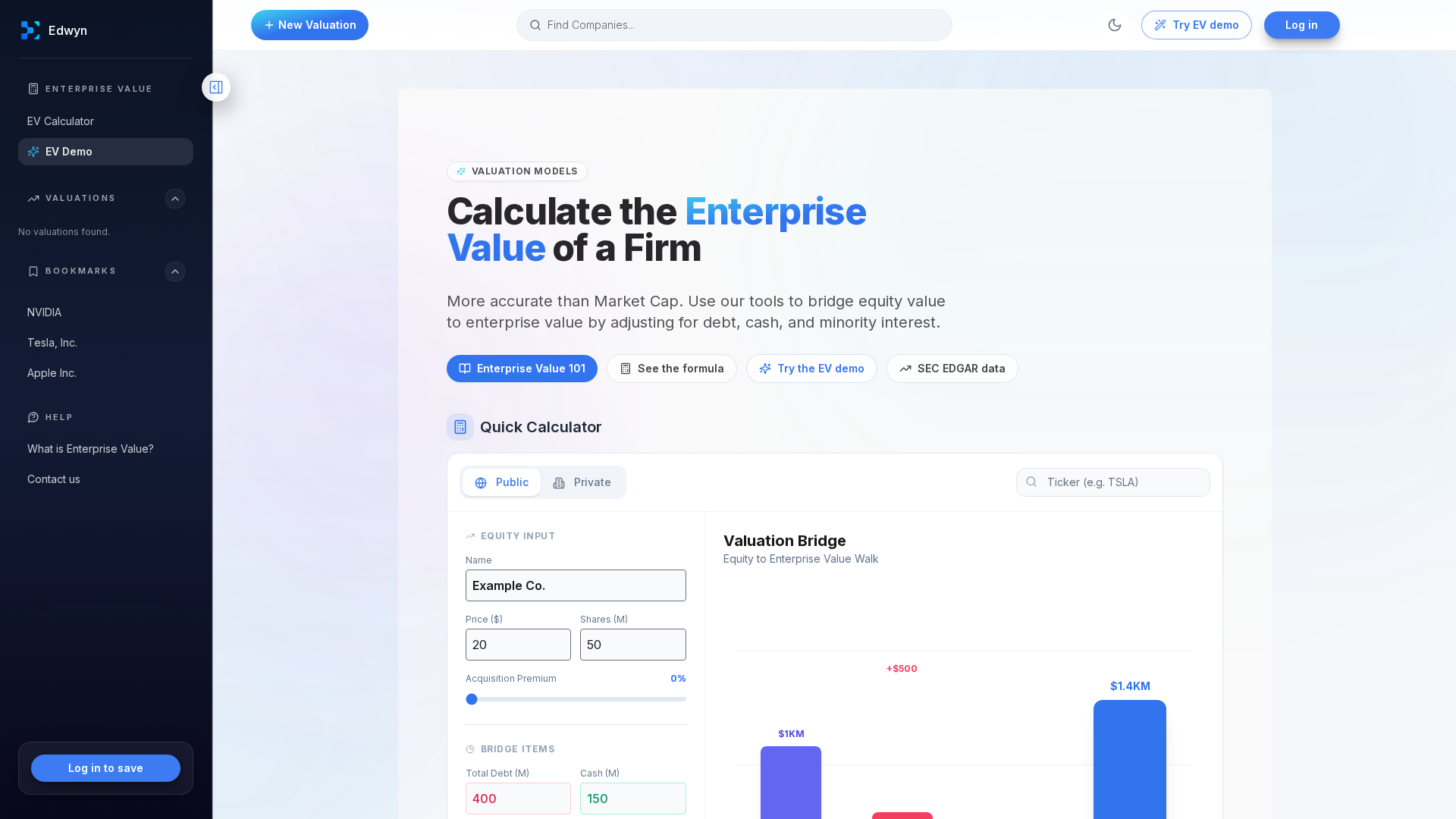 Edwyn is a web-first valuation platform that combines automated SEC EDGAR ingestion, cleaned multi‑year financial statements, peer benchmarking, and built‑in valuation calculators to produce enterprise value estimates and comparative analyses. Users can run an interactive no-login walkthrough/demo, pull structured financials from SEC filings, apply multiples (EV/EBITDA, P/E, P/S), and export CSVs or publish valuation reports. The product targets finance professionals and business owners who want a reproducible, auditable workflow from raw filings to client-ready valuation outputs. Edwyn emphasizes speed, transparency of data sources (SEC filings and market prices), and scenario-driven sensitivity analysis.