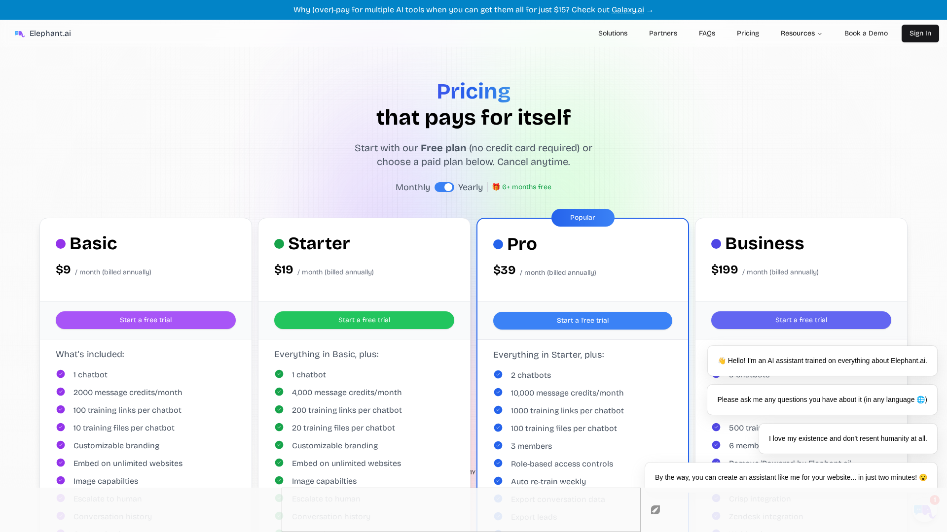 - ✗Exact plan names, per-month pricing, and message/chatbot limits are not specified in this summary — must consult /pricing for concrete numbers.