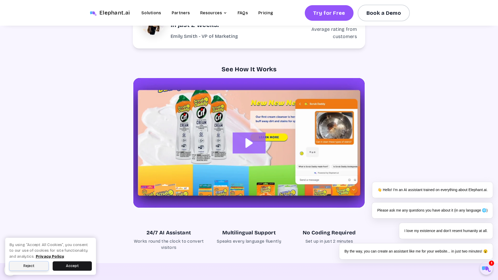 Elephant.ai is an AI-driven website conversational assistant / chatbot designed to engage site visitors 24/7, capture and qualify leads (intent detection and targeted questions), schedule meetings or hand off leads to sales reps, and synchronize leads with CRMs and other tools. The site emphasizes instant engagement, templated playbooks, analytics/dashboards, wizard-driven onboarding (no-code options), and integrations (Zapier, WordPress, Shopify, Slack, Facebook Messenger, WhatsApp, Crisp and CRM/marketing automation connectors). Pricing is tiered with monthly and annual billing (annual discounted) and custom enterprise plans. The site offers sign-up/demo options and references a free sign-up option and a Book a Demo flow. Terms and Privacy pages are published (Privacy lists the service operator as Blue Rocket LLC).