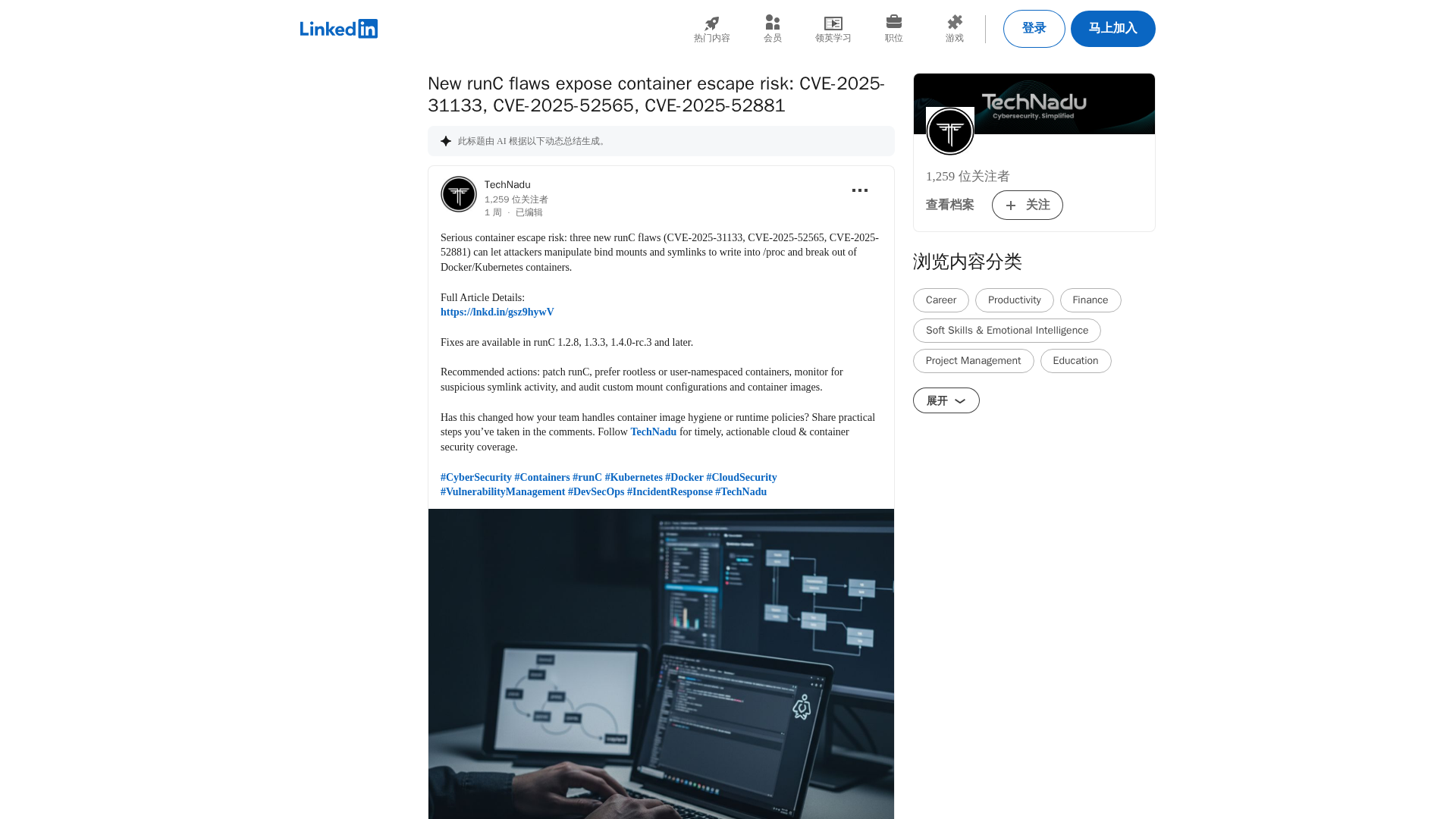 Three runC flaws enable container escapes via mounts and symlinks; patches are available and mitigation steps are advised.