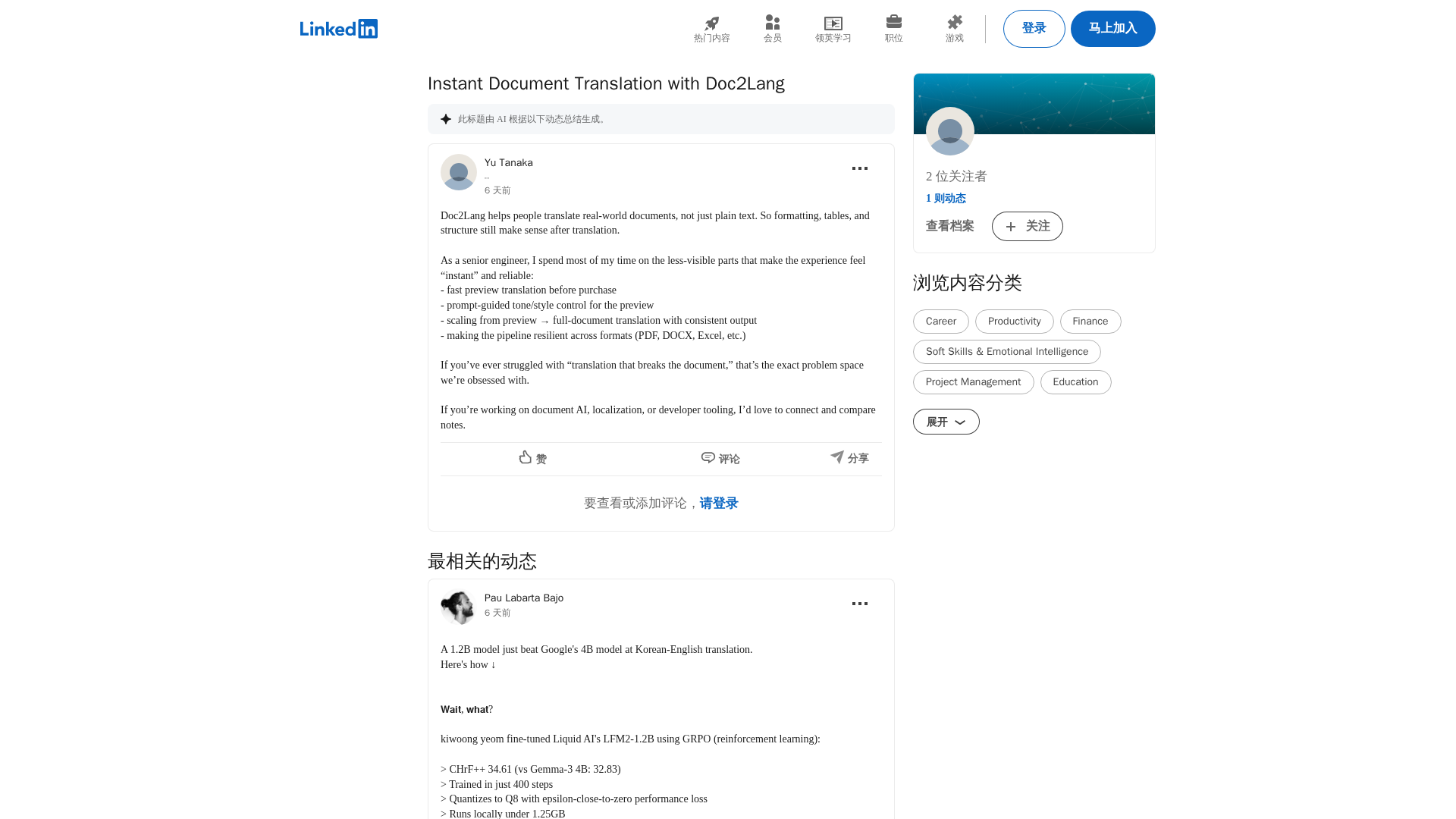 A LinkedIn thread detailing Doc2Lang’s instant, formatting-preserving translation and the evolving role of AI in multilingual document workflows.