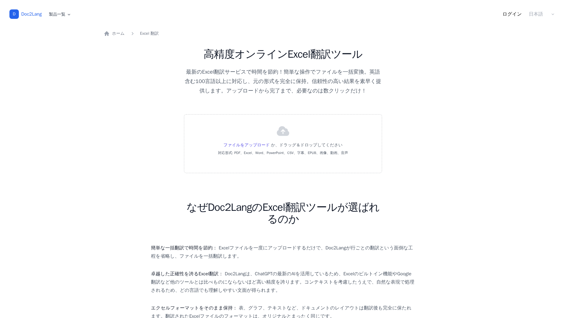 本要約は、Doc2LangのExcel翻訳ページの情報を日本語で整理したものです。主な機能は、Excelファイル全体を一括翻訳し、元の表レイアウト(セル配置・書式)を可能な限り保持する設計です。セル内テキスト・表ヘッダ・ワークシート単位で翻訳対象を細かく制御でき、特定行・シートを除外する等の条件設定にも対応します。ZIPで複数ファイルを同時アップロードしてまとめて処理可能で、CSVはUTF-8推奨。Google SheetsやApple Numbersの取り扱い手順も案内され、無料の部分プレビュー機能を経て翻訳を確認後に支払いを検討できます。対応言語は100言語以上、対応ファイル形式はExcel(XLSX/XLSMなど)をはじめWord、PDF、PowerPoint、CSV、EPUB、IDML、画像、字幕、音声・動画等を含みます。料金は従量課金(トークンベース)に加えクレジット(ポイント)パックを前払いで提供、月額契約は不要、支払いはStripe経由です。