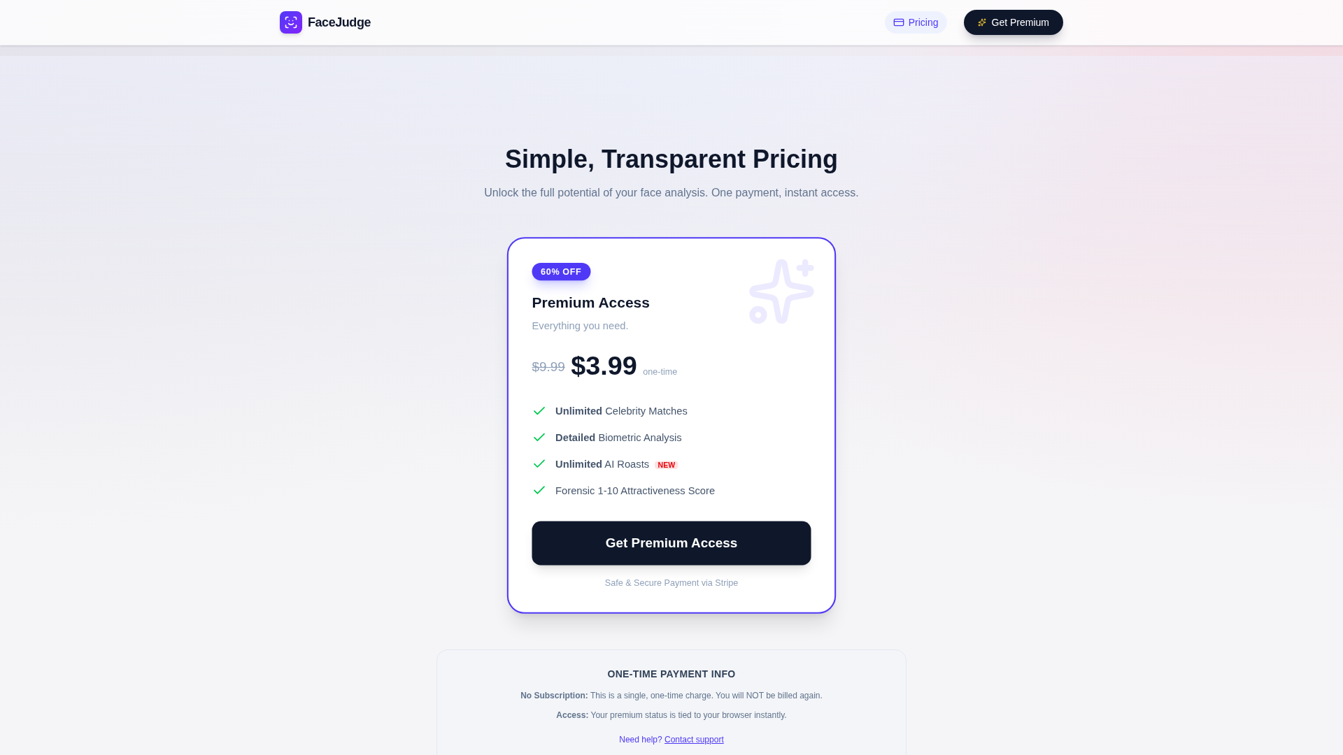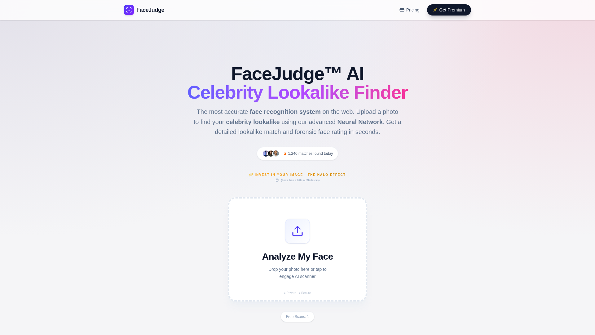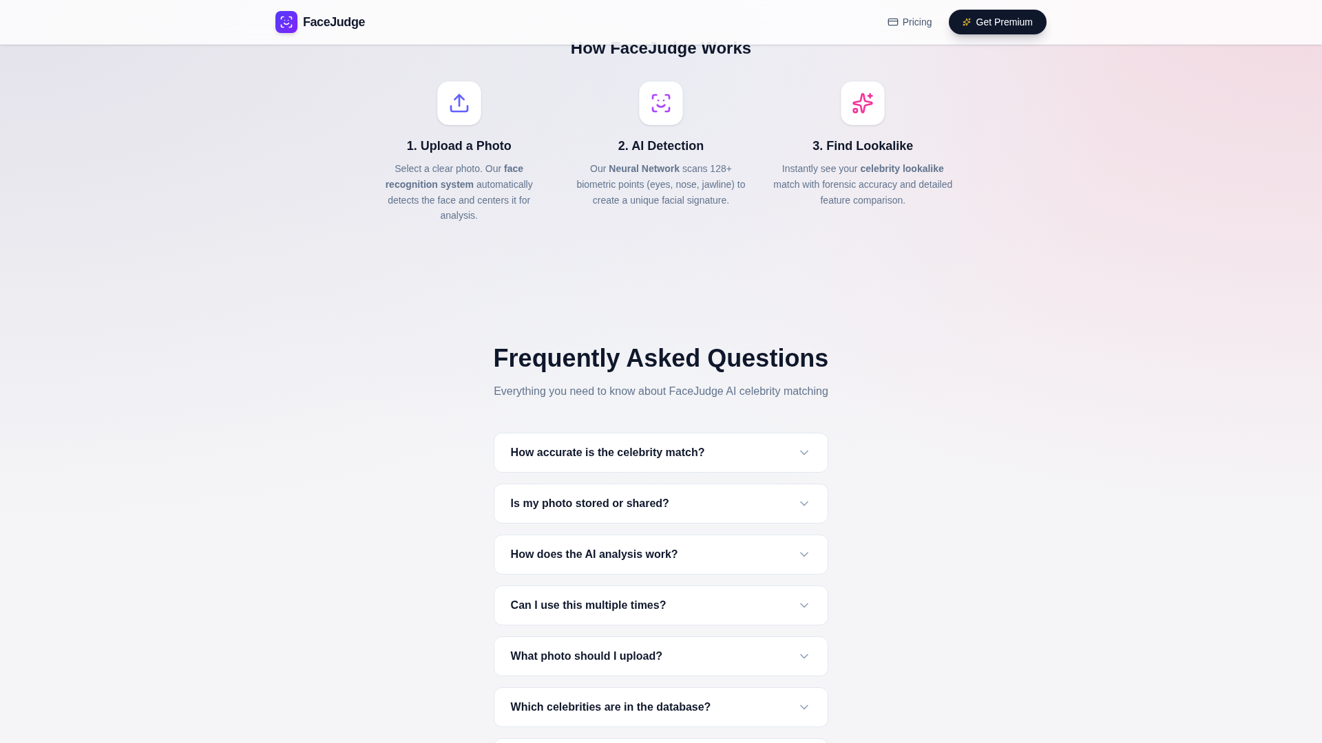 FaceJudge is a web-based, entertainment-focused face analysis tool that matches user photos to celebrity lookalikes using a neural network and biometric feature comparisons. The service describes an automated three-step flow: upload a selfie, have a neural network scan 128+ biometric points to produce a unique facial signature, and view an instant celebrity match along with a forensic-style feature comparison and attractiveness score. FaceJudge emphasizes speed, simplicity and an aspirational “halo effect,” offering real-time processing and claiming not to store uploaded images. Premium access is sold as a single, one-time payment (browser-bound) via Stripe and unlocks unlimited matches and advanced analysis features.